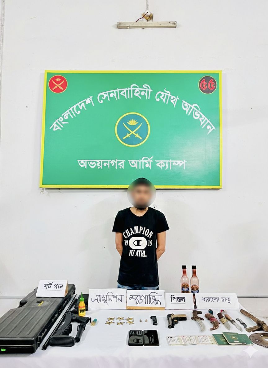 যশোরের অভয়নগরে যৌথবাহিনীর অভিযানে বিপুল পরিমাণ অস্ত্র ও গোলাবারুদসহ এক যুবককে আটক করা হয়েছে। আটক যুবকের নাম রাকিবুল সরদার (২৭)। তিনি অভয়নগর উপজেলার নওয়াপাড়া বাজারের নুরবাগ এলাকার বাসিন্দা এবং লুৎফর রহমানের ছেলে।শনিবার (৩১ জানুয়ারি) ভোররাতে গোপন সংবাদের ভিত্তিতে যৌথবাহিনী অভিযান চালিয়ে তাকে আটক করে। পরে তার স্বীকারোক্তি অনুযায়ী একটি পিস্তল, একটি পিস্তলের ম্যাগাজিন, ৩২ রাউন্ড পিস্তলের গুলি, ২৪টি শর্টগানের খালি কার্তুজ, ৯টি পিস্তলের খালি কার্তুজ, একটি শর্টগানের ব্যারেল, একটি শর্টগানের বুলেট, চারটি চাকু, একটি কুড়াল, তিনটি পাসপোর্ট, দুটি স্মার্টফোন, ১৩টি জাতীয় পরিচয়পত্র, ছয়টি সিমকার্ড, একটি মেমোরি কার্ড এবং ইয়াবা সেবনের তিনটি কাঠি উদ্ধার করা হয়।এ ঘটনায় অভয়নগর থানায় অস্ত্র ও গোলাবারুদ আইনে একটি মামলা দায়ের করা হয়েছে। অভয়নগর থানার অফিসার ইনচার্জ নুরুজ্জামান জানান, আটক আসামির বিরুদ্ধে আইনগত ব্যবস্থা গ্রহণ করে আদালতের মাধ্যমে তাকে জেলহাজতে পাঠানো হয়েছে।
