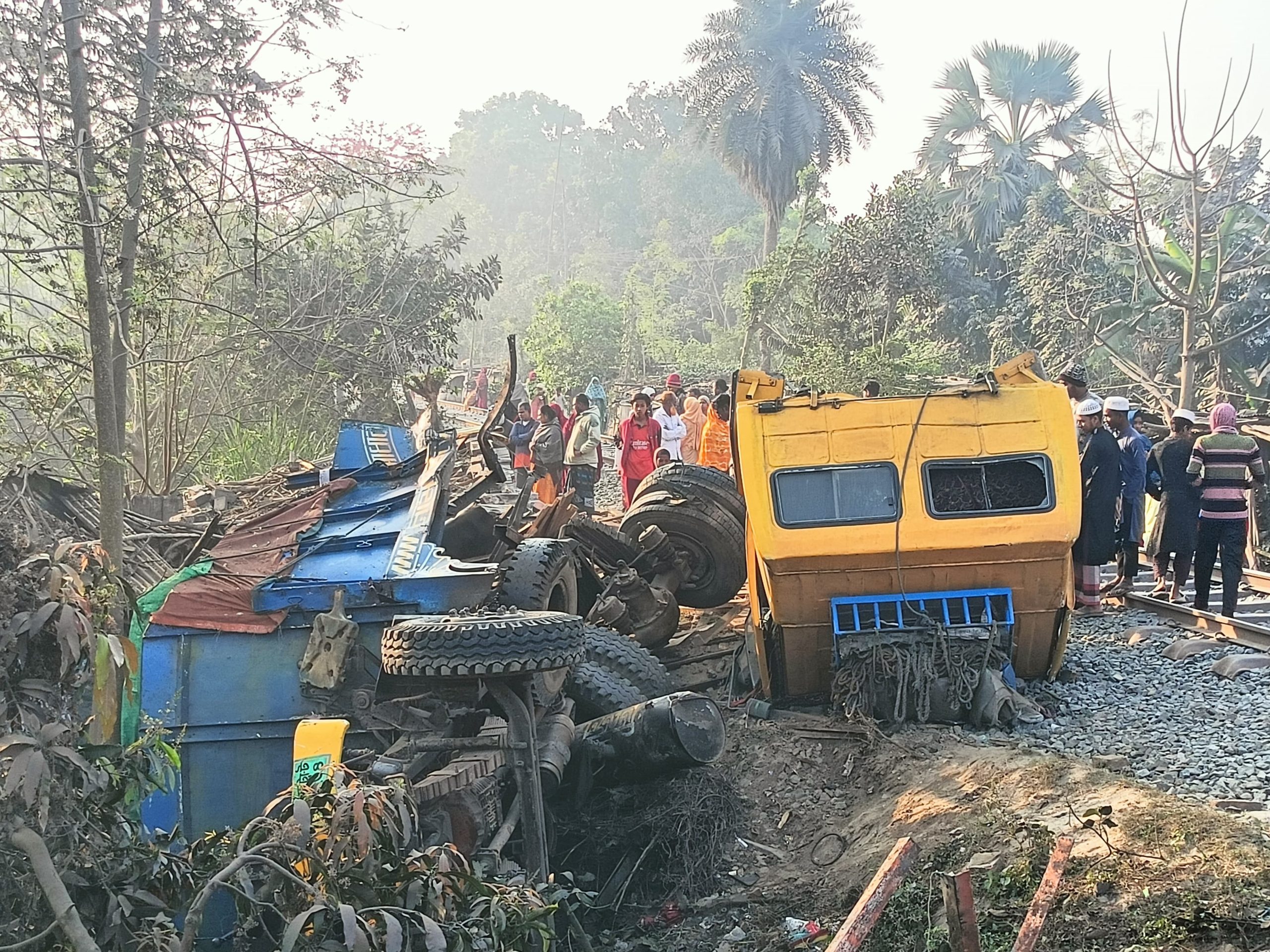 সংঘর্ষের তীব্রতায় ট্রাকটি প্রায় ৫০ মিটার দূরে ছিটকে গিয়ে রেললাইনের পাশের একটি বাড়ির ওপর পড়ে। এতে বাড়িটি আংশিকভাবে ধসে যায়। ঘরের ভেতরে থাকা একই পরিবারের সদস্যরা গুরুতর আহত হন। আহতরা হলেন সানুয়ারা(৫৫), ও সাবিবা ২৫ ও দুই বছরের শিশু আলি।