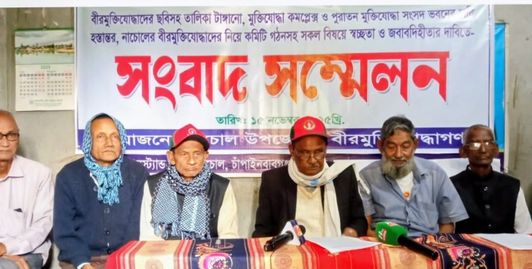 শনিবার বেলা ১১টায় নাচোল প্রেসক্লাবে নাচোল উপজেলা মুক্তিযোদ্ধা কমান্ড কাউন্সিলের সাবেক কমান্ডার বীরমুক্তিযোদ্ধা মোশারফ হোসেনের সভাপতিত্বে সংবাদ সম্মেলনে লিখিত বক্তব্য পাঠ করেন বীরমুক্তিযোদ্ধা চৈত্যদেব বর্মন ও ভবেশ বর্মন। লিখিত বক্তব্যে তারা জানান, নাচোল উপজেলায় মুক্তিযোদ্ধা মন্ত্রনালয়ের তথ্য অনুযায়ী প্রকৃত মুক্তিযোদ্ধা ৪৪জনের তালিকা রয়েছে। এর মধ্যে জীবিত বীরমুক্তিযোদ্ধা ১৯জন। কিন্তু স্বাধীনতা দিবস, শহীদ বুদ্ধিজীবি দিবস ও বিজয় দিবসে ৭১জন জনকে সম্মাননা ও বিভিন্ন উপহার সামগ্রী প্রদান করে থাকায় বীরমুক্তিযোদ্ধাদের মাঝে ক্ষোভের সৃষ্টি হয়েছে। নাচোল ১০জন বীরমুক্তিযোদ্ধা মুক্তিযোদ্ধা মন্ত্রালয়ে আবেদনের প্রেক্ষিতে ০৮/০৭/২৫ ইং তারিখে ৮৪৬ নং স্মারকে মুক্তিযোদ্ধা মন্ত্রনালয় থেকে নাচোল উপজেলা নির্বাহী অফিসারকে প্রকৃত মুক্তিযোদ্ধাদের প্রতিবেদন দাখিলের জন্য নির্দেশক্রমে অনুরোধ করা হলে তিনি প্রয়োজনীয় ব্যবস্থা গ্রহন করেননি বলে দাবী করেন। নাচোল উপজেলা বীরমুক্তিযোদ্ধা কমপ্লেক্স এ দোকান ও নাচোল উপজেলা স্কুলকে ভাড়া দেয়া হয়েছে। এছাড়া নাচোল কলেজ মোড়ে নিজ অর্থায়নে নির্র্মিত ভবনের কোন্দল সৃষ্টির কারনে উপজেলা নির্বাহী অফিসারে পরামর্শে জেলা পরিষদ তালাবন্ধ করে রাখে। গত ১০/০৯/২৫ইং তারিখে ৭সদস্য বিশিষ্ঠ নাচোল উপজেলা মুক্তিযোদ্ধা কমান্ড কাউন্সিল এর আহবায়ক কমিটি গঠন করা হয়। তার মধ্যে চাঁপাইনবাবগঞ্জ সদরের ২জন শিবগঞ্জ উপজেলার ২জন। নাচোল উপজেলার অন্য ৩জনকে না জানিয়ে কমিটিতে নাম অর্ন্তভূক্ত করা হয় বলে দাবী করেন। এই কমিটি বাতিল করার জন্য নাচোলের বীরমুক্তিযোদ্ধাগণ কেন্দ্রীয় মুক্তিযোদ্ধা কমান্ড কাউন্সিলে পূর্বের কমিটি বাতিল করে নতুন কমিটিকে অনুমোদন দেওয়ার আবেদন করেন। এছাড়া উপজেলা প্রশাসনের বিভিন্ন মিটিংএ নাচোলে বীরমুক্তিযোদ্ধাদের আমন্ত্রন জানানো হয়না। লিখিত বক্তব্য আরো বলেন বিভিন্ন ঋন প্রক্রিয়া, বীরনিবাস, কবর সংরক্ষণ,মাসিক সমন্বয়সভাসহ সকল সরকারী অনুষ্ঠানে নাচোলে মুক্তিযোদ্ধাদের বিভিন্ন সুযোগ সুবিধা ব্যবস্থা গ্রহনের দাবী জানান। এছাড়া নাচোল উপজেলা নতুন এ্যাডহক কমিটি গঠন করে মুক্তিযোদ্ধা কমপ্লেক্স ও নিজ অর্থায়নে তৈরি ভবনের তালা খুলে দিয়ে তাদের বসার ব্যবস্থার জোর দাবী জানান। সংবাদ সম্মেলনে উপস্থিত ছিলেন বীরমুক্তিযোদ্ধা উপেন্দ্রনাথ বর্মন, বাসুদেব বর্মন, জুলফিকার, শ্রী দিপেন বর্মন, বাসুদেব বর্মনঅ। এবিষয়ে জেলা মুক্তিযোদ্ধা কমান্ড কাউন্সিলের আহবায়ক আজিজুর রহমানের সাথে ফোনে যোগাযোগ করে তাকে পাওয়া যায়নি। তবে নাচোল উপজেলা মুক্তিযোদ্ধা কমান্ড কাউন্সিলের আহবায়ক মোঃ ইরফান আলী জানান মুক্তি