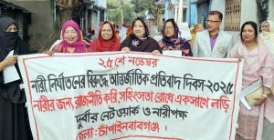 বাংলাদেশে নারী নির্যাতনে বিরুদ্ধে আন্তজাতিক প্রতিবাদ দিবস ২০২৫-এর প্রতিপাদ্য হচ্ছে, নারীর জন্য রাজনীতি করি, সহিংসতা রোধে একসাথে লড়ি’। উক্ত অনুষ্ঠানে সভাপতিত্ব করেন,বৈশাখী মহিলা উন্নয়ন সমিতির সভানেত্রী মোসাঃ সেরিনা খাতুন । প্রধান অতিথি হিসেবে ছিলেন,চাঁপাইনবাবগঞ্জ চেম্বার অব কমার্স এন্ড ইন্ডাস্ট্রির পরিচালক মোঃ শহিদুল ইসলাম শহিদ। স্বাগত বক্তব্য দেন, দুর্বার নেটওয়ার্ক ও নারীপক্ষের ৪টি জেলার দায়িত্বপ্রাপ্ত ও সমতা নারী উন্নয়ন সংস্থা সভানেত্রী মোসাঃ আকসানা খাতুন । স্বাগত বক্তব্যে বলেন,১৯৮১ সাল থেকে এই দিনটি আন্তর্জাতিক নারী নির্যাতন প্রতিবাদ দিবস হিসেবে পালিত হয়। ১৩ অক্টোবর প্রকাশিত বাংলাদেশ পরিসংখ্যান ব্যুরোর জরিপ অনুযায়ী প্রতি চারজনের মধ্যে তিনজন নারী জীবনে কোনো একবার নিকটতম সঙ্গী দ্বারা সহিংসতার শিকার হয়েছেন। এ নির্যাতনের মধ্যে রয়েছে শারীরিক, মানসিক, যৌন ও অর্থনৈতিক সহিংসতা। সরকারের কাছে দাবি, নারীর উপর যেকোন ধরনের সহিংসতা চলবে না।পাঠ্যসূচিতে নারীর প্রতি অসম্মানজনক ও বৈষম্যমূলক বিষয় এবং ভাষা ও শব্দ বাতিল করতে হবে । কেবলমাত্র নারীকে অধস্তন, ও পুরুষের ভোগ্যবস্তু এবং সন্তান জন্মদানের যন্ত্র হিসেবে ব্যবহার করে থাকে।