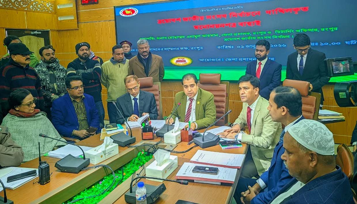 জাতীয় পার্টির চেয়ারম্যান জিএম কাদের, এনসিপি’র সদস্য সচিব আখতারসহ রংপুরের দুটি সংসদীয় আসনে ১৪ প্রার্থীর মনোনয়নপত্র বৈধ হয়েছে। শুক্রবার (২ জানুয়ারী) সকালে জেলা প্রশাসক সম্মেলন কক্ষে রিটার্নিং কর্মকর্তা সদর উপজেলা ও সিটি কর্পোরেশন এলাকা নিয়ে গঠিত রংপুর-৩ আসনের দশজন প্রার্থীর মনোনয়নপত্র যাচাই বাছাই করেন। এতে জাতীয় পার্টির চেয়ারম্যান জিএম কাদের, বিএনপি’র সামসুজ্জামান সামু, জামায়াতের মাহবুবার রহমান বেলাল, ইসলামী আন্দোলনের আমিরুজ্জামান পিয়াল, বাংলাদেশ সমাজতান্ত্রিক দল-বাসদের আব্দুল কুদ্দুস, স্বতন্ত্র প্রার্থী তৃতীয় লিঙ্গের আনোয়ারা ইসলাম রানী, বাংলাদেশ খেলাফত মজলিসের নুর আলম সিদ্দিকের মনোনয়নপত্র বৈধ ঘোষণা করা হয়। এছাড়া গ্রেফতারী পরোয়ানা ও রাজস্ব বকেয়া থাকায় খেলাফত মজলিতের প্রার্থী তৌহিদুর রহমান মন্ডল, রাজস্ব বকেয়া থাকায় বাংলাদেশের সমাজতান্ত্রিক দল বাসদের(মার্কসবাদী) আনোয়ার হোসেন বাবলু এবং মনোনয়নপত্রের সাথে জমা দেয়া সংসদীয় আসনের শতকরা ১ ভাগ ভোটারের তালিকায় গড়মিল থাকায় বিএনপি’র প্রতিষ্ঠাতা সদস্য স্বতন্ত্র প্রার্থী রিটার রহমানের মনোনয়পত্র অবৈধ ঘোষণা করা হয়।