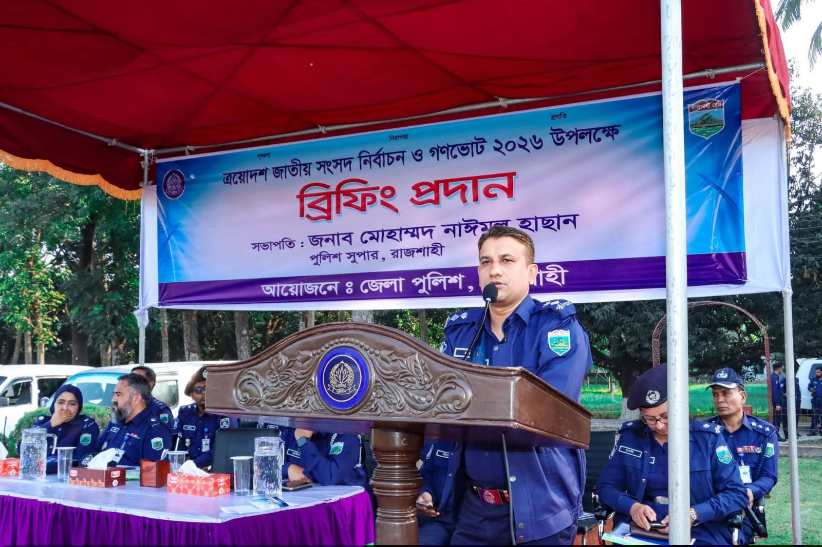 আজ ১০ ফেব্রুয়ারি ২০২৬ খ্রি. দুপুর ০৩:০০ ঘটিকায় রাজশাহী জেলা পুলিশ লাইন্স মাঠে "ত্রয়োদশ জাতীয় সংসদ নির্বাচন ও গণভোট-২০২৬" শান্তিপূর্ণ, অবাধ ও সুষ্ঠুভাবে সম্পন্ন করার লক্ষ্যে এক গুরুত্বপূর্ণ ব্রিফিং প্যারেড অনুষ্ঠিত হয়। উক্ত ব্রিফিং প্যারেডের সভাপতিত্ব করেন রাজশাহী জেলার সুযোগ্য পুলিশ সুপার জনাব মোহাম্মদ নাঈমুল হাছান মহোদয়।