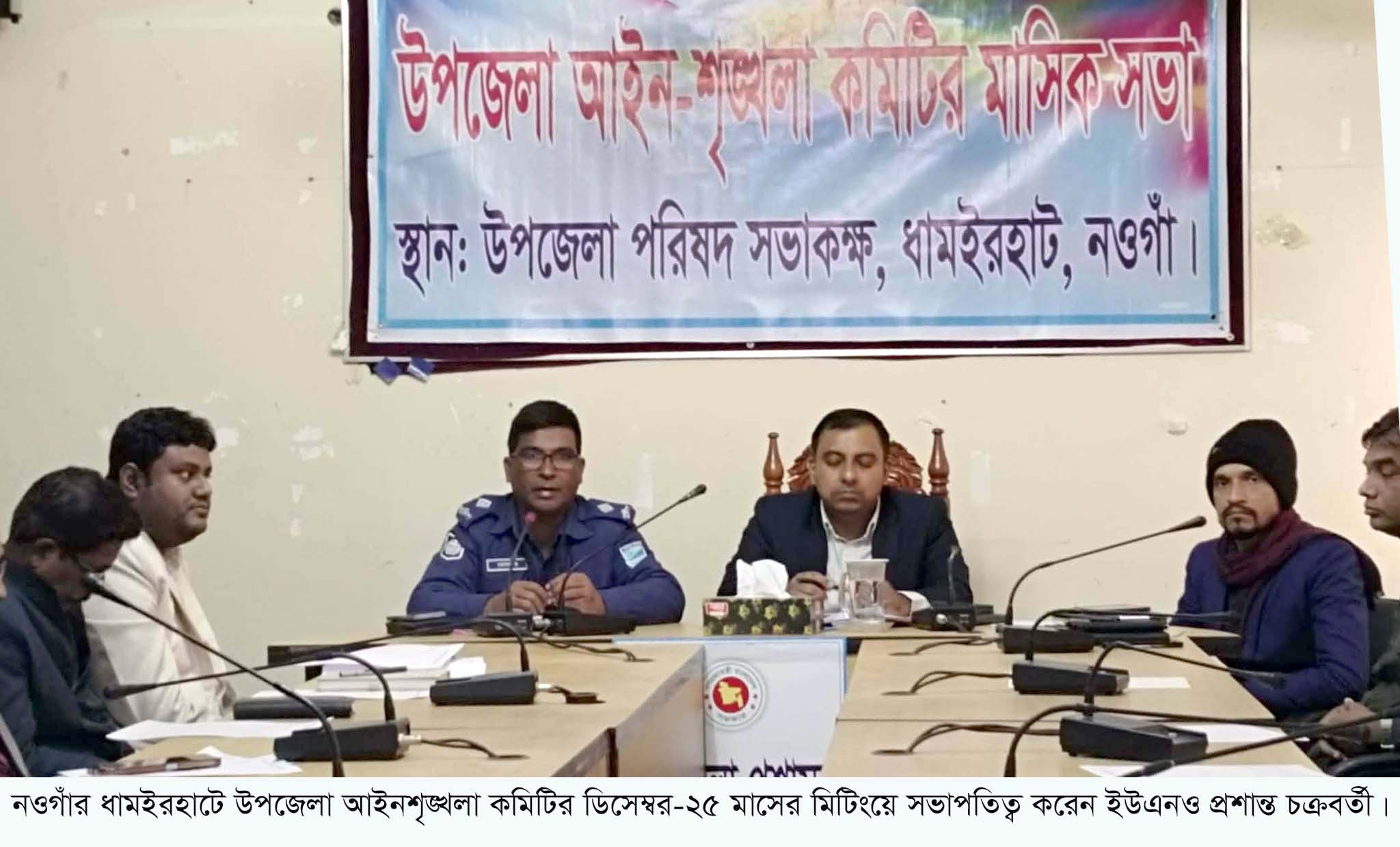 ধামইরহাট (নওগাঁ) প্রতিনিধি: নওগাঁর ধামইরহাটে আইনশৃংখলা কমিটির মাসিক সভা অনুষ্ঠিত হয়েছে। ২৪ ডিসেম্বর বুধবার দুপুরে উপজেলা পরিষদ সভাকক্ষে অনুষ্ঠিত সভায় সভাপতিত্ব করেন ইউএনও প্রশান্ত চক্রবর্তী। সভায় সাম্প্রতিক আইন শৃংখলা পরিস্থিতি, মাদক, চোরাকারবারি, বাল্য বিবাহ, ইভটিজিং ইত্যাদি বিষয় উথ্যাপন হয়। আলোচনায় অংশ গ্রহণ করেন ওসি মোখলেছুর রহমান, বিজিবি কালুপাড়া কোম্পানি কমান্ডার সুবেদার আইয়ুব আলী, বস্তাবর কোম্পানি কমান্ডার সুবেদার তৌফিকুর রহমান, গ্রাম আদালত উপজেলা কো-অর্ডিনেটর ধীমান দেবনাথ, ধামইরহাট প্রেসক্লাবের সভাপতি আঃ রাজ্জাক, উপজেলা প্রেস ক্লাবের সভাপতি এম এ মালেকসহ বিভিন্ন দপ্তরের কর্মকর্তা ও ইউপি চেয়ারম্যানগন। সভায় আইনশৃঙ্খলা বিষয়ে সন্তোষ প্রকাশ করা হয়। আগামী জাতীয় নির্বাচন সুষ্ঠুভাবে সম্পন্ন করতে ইউএনও প্রশান্ত চক্রবর্তী সকল শ্রেণির মানুষের সহযোগিতার আহবান জানান।