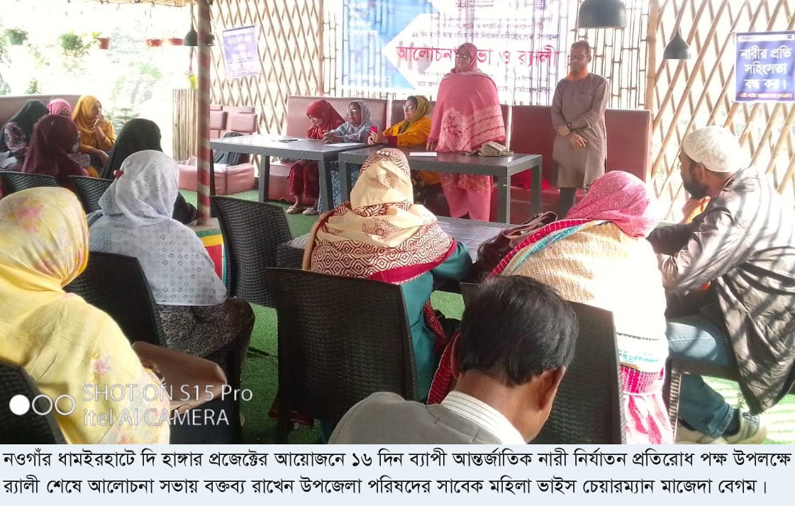 নওগাঁর ধামইরহাটে সংঘাত নয়, শান্তি ও সম্প্রীতির বাংলাদেশ গড়ি শীর্ষক প্রতিপাদ্যে ১৬ দিন ব্যাপী আন্তর্জাতিক নারী নির্যাতন প্রতিরোধ পক্ষ উপলক্ষে র্যালী ও আলোচনা সভা অনুষ্ঠিত হয়েছে। এফসিডিওর অর্থায়নে দি হাঙ্গার প্রজেক্ট বাংলাদেশের মাল্টি-স্টেকহোল্ডার ইনিসিয়েটিভ ফর পিস এন্ড স্ট্যাবিলিটি (এম.আই.পি.এস) প্রকল্পের আওতায় ৪ ডিসেম্বর বেলা ১১ টায় একটি র্যালী উপজেলার প্রধান সড়ক প্রদক্ষিণ করে। র্যালী শেষে ধামইরহাট পৌর সদরস্থ্য চাইনিজ রেস্টুরেন্ট ‘টু-ব্রস’ এ ওয়েভ সভাপতি সাবেক মহিলা ভাইস চেয়ারম্যান মাজেদা বেগমের সভাপতিত্বে আলোচনা সভায় প্রধান অতিথি হিসেবে বক্তব্য রাখেন দি হাঙ্গার প্রজেক্ট পিএফজি’র ধামইরহাটের উপদেষ্টা সাবেক পৌর প্রশাসক মাহবুবার রহমান চৌধুরী চপল। পিএফজির উপজেলা কো-অর্ডিনেটর সাংবাদিক আবু হেনা মোঃ মোস্তফা কামাল বাবু’র সঞ্চালনায় আলোচনা সভায় বিশেষ অতিথির বক্তব্য রাখেন উপজেলা বিএনপির সভাপতি এম এ ওয়াদুদ, ধামইরহাট পৌর বিএনপির সভাপতি মো. শহিদুর রহমান সরকার, সাবেক মহিলা ভাইস চেয়ারম্যান আঞ্জুয়ারা বেগম, বীর মুক্তিযোদ্ধা ও পিএফজির এ্যাম্বাসেডর মো. আব্দুর রউফ মন্ডল, উপজেলা মহিলা দলের সভানেত্রী সেলিনা আকতার, পৌর বিএনপির সহ-মহিলা বিষয়খ সম্পাদক শাহিনা ইয়াসমিন, সাবেক নারী কাউন্সিলর জান্নাতুন ফেরদৌস কবিতা, আদিবাসী নারী নেত্রী ডলি দাস প্রমুখ।