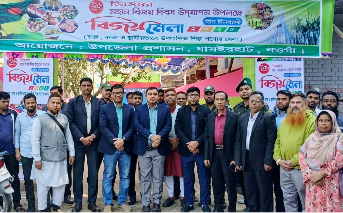 নওগাঁর ধামইরহাটে উপজেলা প্রশাসনের আয়োজনে মহান বিজয় দিবস উদযাপন উপলক্ষে ৩ দিন ব্যাপী চারু,কারু ও স্থানীয়ভাবে উৎপাদিত পণ্যে নিয়ে বিজয় মেলার শুভ উদ্বোধন ও আলোচনা সভা অনুষ্ঠিত হয়। বিজয় মেলার উদ্বোধন করেন উপজেলা নির্বাহী অফিসার প্রশান্ত চক্রবর্তী। ২৫ ডিসেম্বর দুপুর ১২ টায় উপজেলা পরিষদ চত্বরে স্মৃতি সৌধের পাদদেশে মেলা উদ্বোধনকালে উপস্থিত ছিলেন উপজেলা কৃষি অফিসার কৃষিবিদ তৌফিক আল জোবায়ের, মাধ্যমিক শিক্ষা অফিসার আব্দুল্লাহ আল মামুন, যুব উন্নয়ন অফিসার কামরুজ্জামান সরদার, প্রকল্প বাস্তবায়ন অফিসার মনসুর আলী, সমাজসেবা অফিসার এ টি এম ফসিউল আলম, আনসার ভিডিপি অফিসার মো. হিরু, ইউপি চেয়ারম্যান ইসমাইল হোসেন মোস্তাক প্রমূখ। উদ্বোধন শেষে ইউএনও প্রশান্ত চক্রবর্তী স্থানীয় ভাবে উৎপাদিত পণ্যের বিভিন্ন স্টল ঘুরে ঘুরে দেখেন।