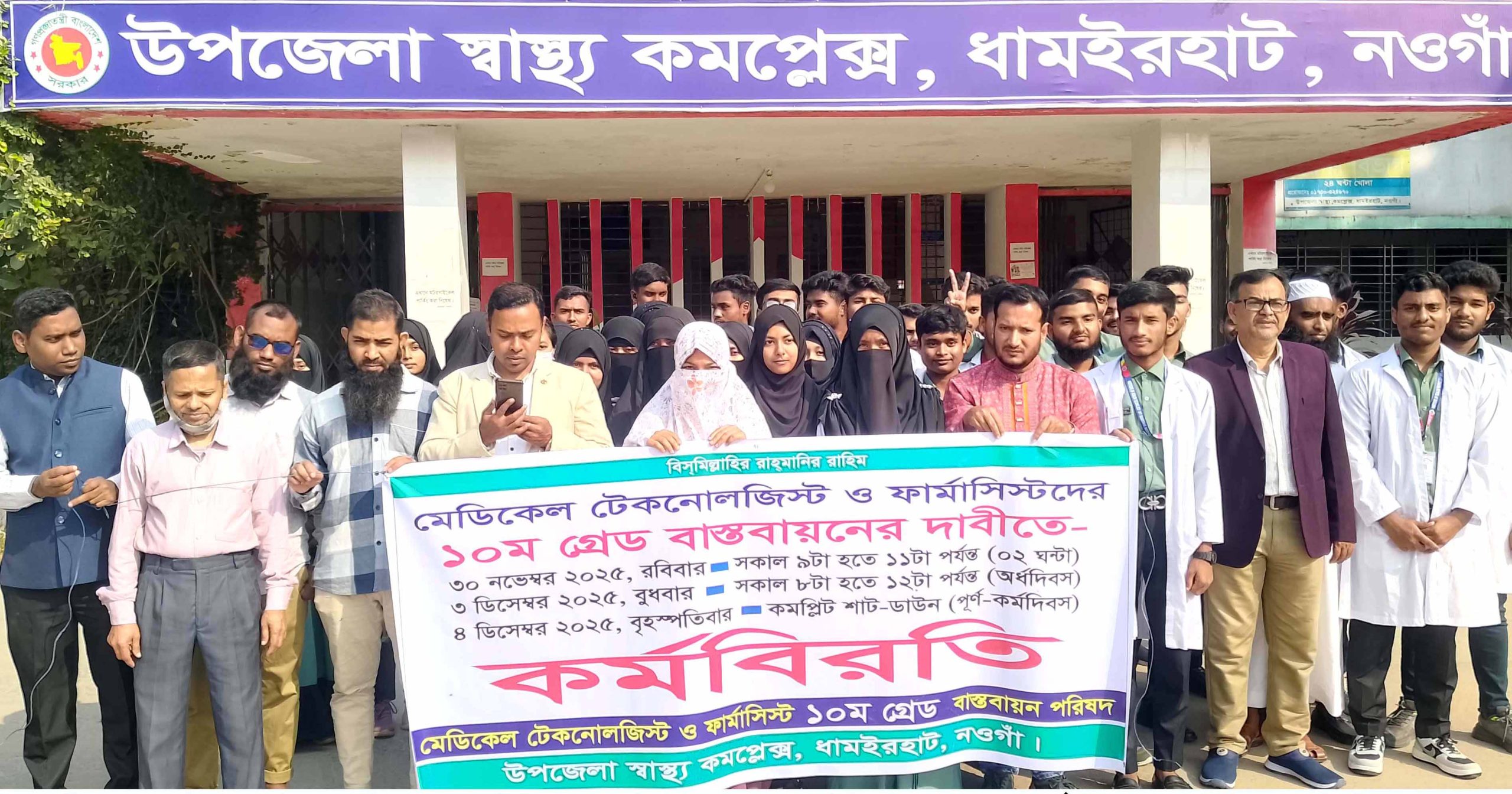 ধামইরহাট (নওগাঁ) প্রতিনিধিঃ নওগাঁর ধামইরহাটে মেডিকেল টেকনোলজিস্ট ও ফার্মাসিস্টদের ১০ম গ্রেড বাস্তবায়ন পরিষদের উদ্যোগে কর্মবিরতি কর্মসূচি পালন করা হয়েছে। ৩০ নভেম্বর সকাল ৯ টা থেকে ১১ টা পযন্ত ১০ম গ্রেড বাস্তবায়নের দাবীতে ধামইরহাট স্বাস্থ্য কমপ্লেক্সের মেডিকেল টেকনোলজিস্ট ও ফার্মাসিস্টগণদের এই আন্দোলনে একাত্বতা প্রকাশ করেন আইএইচটির শিক্ষার্থীরা।