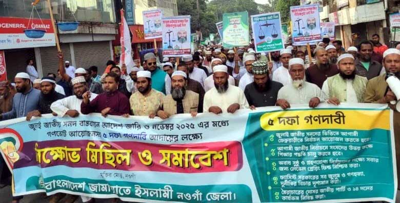 নওগাঁ প্রতিনিধিঃ আজ শুক্রবার জুম্মার নামাজ শেষে নওগাঁ শহরের কেন্দ্রীয় মসজিদের সামনে মুক্তির মোড়ে বাংলাদেশ জামায়াতে ইসলামী নওগাঁ জেলা শাখার বিক্ষোভ মিছিল ও সমাবেশ অনুষ্ঠিত হয়েছে। বিক্ষোভ কারীরা জুলাই জাতীয় সনদ বাস্তবায়ন ও নভেম্বর ২০২৫ সালের মধ্যে গণভোট আয়োজনসহ ৫ দফা গণদাবি আদায়ের দাবি জানায়।