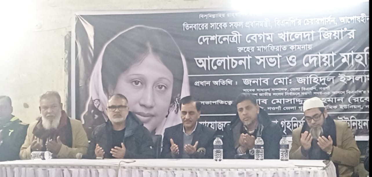 নওগাঁ প্রতিনিধিঃ বাংলাদেশর সাবেক প্রধানমন্ত্রী ও বিএনপির চেয়ারপারসন মরহুমা বেগম খালেদা জিয়া'র রুহের মাগফেরাত কামনায় নওগাঁয় আলোচনা সভা ও দোয়া মাহফিল অনুষ্ঠিত হয়েছে। রোববার সন্ধ্যায় শহরের জিলা স্কুল হল রুমে নওগাঁ জেলা গৃহনির্মাণ শ্রমিক ইউনিয়নের আয়োজনে এ আলোচনা সভা ও দোয়া মাহফিল অনুষ্ঠিত হয়। উক্ত দোয়া মাহফিলে প্রধান অতিথি হিসেবে উপস্থিত ছিলেন নওগাঁ জেলা বিএনপির সাবেক সাধারণ সম্পাদক ও ত্রয়োদশ জাতীয় সংসদ নির্বাচনে নওগাঁ -৫ সদর আসনের বিএনপি মনোনীত প্রার্থী জাহিদুল ইসলাম ধলু। নওগাঁ জেলা গৃহনির্মাণ শ্রমিক ইউনিয়নের সভাপতি মোসাদ্দুর রহমান রকেটের সভাপতিত্বে এসময় নওগাঁ জেলা বিএনপির সাধারণ সম্পাদক মামুনুর রহমান রিপন, সাংগঠনিক সম্পাদক শফিউল আযম রানা, জেলা যুবদলের সদস্য সচিব রুহুল আমিন মুক্তার, জেলা ছাত্র দলের ভারপ্রাপ্ত সভাপতি জাকারিয়া হোসেন জাকির, জেলা সেচ্ছাসেবক দলের আহবায়ক শফিউল আজম টুলু, নওগাঁ জেলা গৃহনির্মাণ শ্রমিক ইউনিয়নে সাধারণ সম্পাদক সবুজ সহ নওগাঁ জেলা বিএনপির অঙ্গ সহযোগী সংগঠনের বিভিন্ন পযার্য়ের নেতৃবৃন্দ ও নওগাঁ জেলা গৃহনির্মাণ শ্রমিক ইউনিয়নে সদস্যরা উপস্থিত ছিলেন। আলোচনা সভা শেষে বিএনপির চেয়ারপারসন সাবেক প্রধানমন্ত্রী মরহুমা বেগম খালেদা জিয়া'র রুহের মাগফেরাত কামনায় বিশেষ দোয়া করা হয়।