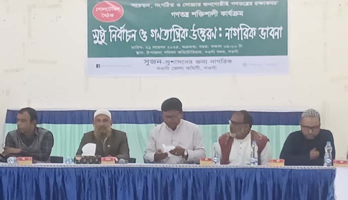 মেহেদী হাসান অন্তর মাল্টিমিডিয়া ইনচার্জঃ সুষ্ঠ নির্বাচন ও গণতান্ত্রিক উত্তরণ: নাগরিক ভাবনা শীর্ষক এক গোলটেবিল বৈঠক আজ শুক্রবার সকাল ৯টায় নওগাঁ সদর উপজেলা পরিষদ অডিটোরিয়ামে অনুষ্ঠিত হয়েছে। সুশাসনের জন্য নাগরিক সুজন, নওগাঁ জেলা কমিটির আয়োজনে এই গোল টেবিল বৈঠক অনুষ্ঠিত হয়।