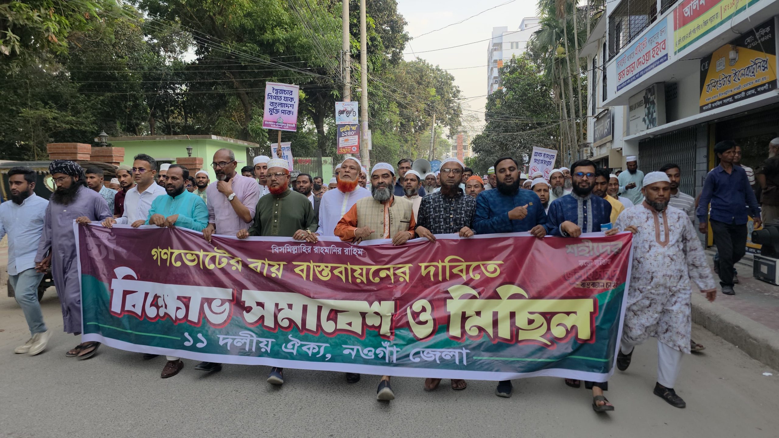 নওগাঁ প্রতিনিধি: কেন্দ্র ঘোষিত কর্মসূচির অংশ হিসেবে গনভোটের রায় বাস্তবায়নের উদ্যেশ্যে নওগাঁয় বিক্ষোভ মিছিল ও সমাবেশ অনুষ্ঠিত হয়েছে। রোববার বিকেল সাড়ে ৫টায় মুক্তির মোড় মডেল মসজিদ থেকে একটি বিক্ষোভ মিছিল বের হয়ে শহরের প্রধান সড়ক প্রদক্ষিন করে মুক্তি মোড় কেন্দ্রীয় শহীদ মিনারে সমাবেশ অনুষ্ঠিত হয়। উক্ত সমাবেশে প্রধান অতিথির বক্তব্য রাখেন জামায়াতের কেন্দ্রীয় মজলিসে সুরা সদস্য ও নওগাঁ জেলা জামায়াতের আমির খ ম আব্দুর রাকিব। এসময় আরোও বক্তব্য রাখেন এনসিপি জেলা আহবায়ক মাহফুজুর রহমান রুবেল চৌধুরী, এবি পার্টির জেলা কমিটির আহবায়ক এডভোকেট কাজী আতিকুর রহমান, নওগাঁ জেলা জামায়াতের নায়েবে আমির ও জামায়াত মনোনীত মেয়র পদপ্রার্থী অধ্যাপক মহিউদ্দিন, জামায়াতের কেন্দ্রীয় মজলিসের সুরার সদস্য ও নওগাঁ জেলা জামায়াতের সেক্রেটারি এ্যাডঃ আ স ম সায়েম, বাংলাদেশ খেলাফত মজলিস এর জেলা উপদেষ্টা খন্দকার রেজাউর রহমান টুকু, খেলাফত মজলিসের জেলা সহ সাধারন সম্পাদক ডাঃ আবু সাইদ, শিবিরের জেলা সভাপতি আজফারুল ইসলাম প্রমুখ। অনুষ্ঠান পরিচালনা করেন নওগাঁ সদর উপজেলা জামায়াতের আমির এ্যাডঃ আব্দুর রহিম। সমাবেশে বক্তারা বলেন, গণভোটের রায় প্রত্যাখ্যান করে জনগণের সাথে প্রতারণা করেছে বিএনপি সরকার। অবলম্বে গনভোভোটের রায় বাস্তবায়নের দাবী করেন। জুলাই সনদের দ্রুত বাস্তবায়নসহ অবিলম্বে সাংস্কার কার্যকরের দাবি করে বক্তব্য রাখেন ১১ দলীয় নেতৃবৃন্দ।