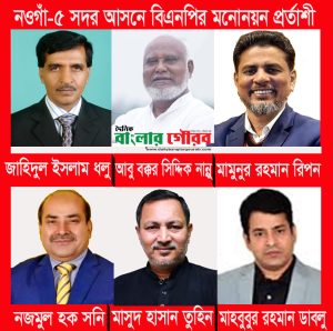 নওগাঁ সদর–৫ আসনঃ এখনো প্রার্থী ঘোষণা করেনি বিএনপি। দলীয় মনোনয়ন পেতে তৎপর জেলা বিএনপির সাবেক সাধারণ সম্পাদক জাহিদুল ইসলাম ধলু, বর্তমান সভাপতি আবু বক্কর সিদ্দিক, সাধারণ সম্পাদক মামুনুর রহমান রিপন, কেন্দ্রীয় সহ-সমবায়বিষয়ক সম্পাদক ও সাবেক মেয়র নজমুল হক সনি, বিএনপির নেতা মাসুদ হাসান তুহিন এবং সাবেক ছাত্রনেতা মাহবুবুর রহমান ডাবলু মাঠে আলোচনা আছেন। বিএপির সঙ্গে নির্বাচনী জোট হলে দলকে আসনটি ছেড়ে দিতে পারে জন্য এখন পযর্ন্ত কোন প্রার্থী ঘোষনা করা হয়নি। তবে ২০১৮ সালে জেলা বিএনপির সাবেক সাধারণ সম্পাদক জাহিদুল ইসলাম ধলু এআসনে ধানের শীষের ভোট করাই পৌর ও উপজেলা বিএপির সব আন্দোলন-সংগ্রামে মাঠে সক্রিয় ছিলেন এবং দূর্দিনে তৃণমূল নেতা কর্মী ও সমর্থকদের পাশে ছিলেন তিনি, একারণে মনোনয়ন দড়ে ও তৃণমূল নেতা কর্মী ও সমর্থকদের অস্থার প্রার্থী ও জনতার এমপি হয়ে উঠেন তিনি।