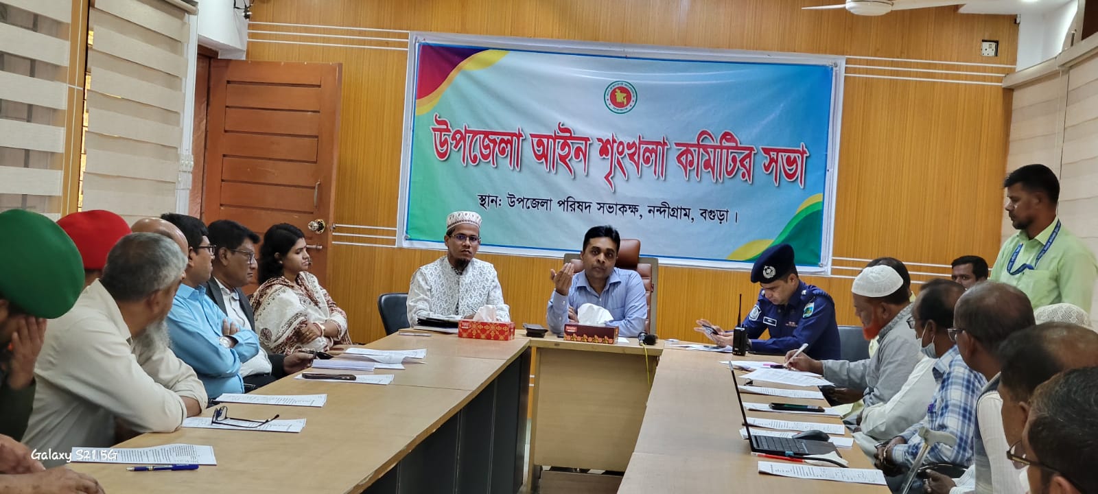 নন্দীগ্রাম (বগুড়া) প্রতিনিধিঃ বগুড়ার নন্দীগ্রাম উপজেলা মাসিক আইন শৃঙ্খলা কমিটির সভা অনুষ্ঠিত হয়েছে। ২০শে নভেম্বর (বৃহস্পতিবার) সকাল সাড়ে ১০ টায় উপজেলা পরিষদের সভাকক্ষ ভদ্রাবতীতে উপজেলা নির্বাহী অফিসার আরিফুল ইসলাম এর সভাপতিত্বে এ সভা অনুষ্ঠিত হয়। এতে বক্তব্য রাখেন উপজেলা কৃষি অফিসার গাজিউল হক, উপজেলা প্রাণীসম্পদ অফিসার কল্পনা রানী রায়, উপজেলা সিনিয়র মৎস্য কর্মকর্তা আন্না রানী দাস, উপজেলা স্বাস্থ্য কর্মকর্তা ডা. তোফাজ্জল হোসেন মন্ডল, সাবেক উপজেলা চেয়ারম্যান নুরুল ইসলাম মন্ডল উপজেলা বিএনপির সাধারণ সম্পাদক বেলায়েত হোসেন আদর, পৌর বিএনপির সভাপতি আলেকজান্ডার, নন্দীগ্রাম থানার ওসি ফইম উদ্দিন, উপজেলা মাধ্যমিক শিক্ষা অফিসার শফিকুল ইসলাম, উপজেলা প্রকল্প বাস্তবায়ন অফিসার সরদার ফজলুল করিম, উপজেলা প্রকৌশলী নুরনবী খান, প্রাথমিক শিক্ষা অফিসার এসএস সারোয়ার জাহান, উপজেলা সমাজসেবা অফিসার গোলাম মোস্তফা, উপজেলা পরিসংখ্যান অফিসার রবিউল ইসলাম, বুড়ইল ইউপি চেয়ারম্যান জিয়াউর রহমান জিয়া, ভাটগ্রাম ইউপি চেয়ারম্যান আবুল কামাল আজাদ, বীর মুক্তিযোদ্ধা শাহাজাহান আলী সাজু, ওয়াসিম উদ্দিন, নন্দীগ্রাম মডেল প্রেসক্লাবের সাধারণ সম্পাদক প্রভাষক জাকারিয়া লিটন, যুগ্ম-সাধারণ সম্পাদক প্রভাষক আব্দুর রউফ উজ্জল, উপজেলা প্রেসক্লাবের সভাপতি ফজলুর রহমান, সাধারণ সম্পাদক আখতার হোসেন দুলাল, কার্যকরী সদস্য মামুন আহম্মেদ, নন্দীগ্রাম শিল্প ও বণিক সমিতির সভাপতি বিশিষ্ট ব্যবসায়ী মোকলেছুর রহমান, নন্দীগ্রাম উপজেলা শিল্প ও বণিক সমিতির সহ-সভাপতি বিশিষ্ট ব্যবসায়ী আবুল কাশেম, পল্লি বিদ্যুতের এজিএম আবু হানিফ, ফায়ার সার্ভিস ও সিভিল ডিফেন্স এর ভারপ্রাপ্ত স্টেশন মাস্টার রফিকুল ইসলাম, কুন্দারহাট হাইওয়ে থানার ওসির প্রতিনিধি এসআই রাফিউল ইসলাম, উপজেলা গ্রাম আদালতের সমন্বয়ক ইয়াছিন আলী প্রমুখ। এছাড়াও উপজেলার বিভিন্ন শিক্ষা প্রতিষ্ঠানের শিক্ষকগণ উপস্থিত ছিলেন।