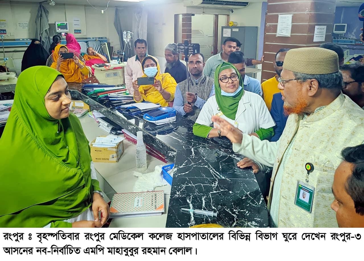 এমপি মাহাবুবুর রহমান বেলাল বলেন, রংপুর মেডিকেল কলেজ হাসপাতাল বিভাগের একটি বৃহৎ সেবামূলক প্রতিষ্ঠান। এ হাসপাতালে জনবল রয়েছে ৬’শ শয্যার। হাসপাতালকে এক হাজার শয্যা উন্নীত করা হলেও জনবল বৃদ্ধি করা হয়নি। বর্তমানে রংপুর মেডিকেল কলেজ হাসপাতালে চিকিৎসাধীন থাকে আড়াই হাজারেরও বেশি রোগী। এছাড়া হাসপাতালের বর্জ্য ব্যবস্থাপনা অত্যন্ত নাজুক। এছাড়া দালালদের দৌড়াত্ম রয়েছে। রংপুর মেডিকেল কলেজ হাসপাতালের সমস্যা সমাধানে আমার সাধ্যমত চেষ্টা করে যাব।