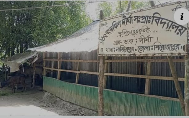 সরেজমিনে গিয়ে দেখা যায়, উপজেলার ৪ নম্বর দীর্ঘা ইউনিয়নের ১৮২ নম্বর দক্ষিণ দীর্ঘা সরকারি প্রাথমিক বিদ্যালয়ের শ্রেণিকক্ষের দরজায় তালা ঝুলছে। ভাঙা টিনের বেড়া, কক্ষের ভেতরে ছড়িয়ে-ছিটিয়ে থাকা নির্মাণ সামগ্রী এবং এলোমেলো বেঞ্চ শিক্ষাব্যবস্থার বেহাল চিত্র তুলে ধরছে। একই সঙ্গে শ্রেণিকক্ষ সংলগ্ন স্থানে গড়ে উঠেছে একটি গরুর খামার, যা শ্রেণিকক্ষের তুলনায় বেশি পরিচ্ছন্ন- এমন বাস্তবতায় পাঠদান কার্যক্রম নিয়েই প্রশ্ন উঠেছে।