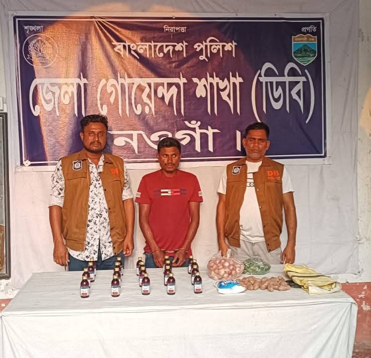 ১৪-০৪-২০২৬ জেলা গোয়েন্দা শাখা নওগাঁ এর একটা টীম মাদক বিরোধী অভিযান পরিচালনা করে। এ সময় গোয়েন্দা সংবাদের ভিত্তিতে জানা যায় বদলগাছি থানাধীন শুরকালী বাজার এলাকায় একজন ব্যাক্তি ফেন্সিডিল বিক্রি করার জন্য অবস্থান করছে। উক্ত সংবাদের ভিত্তিতে অভিযানিক টীম ঘটানাস্থলে সন্দেহ জনক ভাবে মুভমেন্ট করায় আসামি মাহফুজ (৩৫) পিতা আ: হাই গ্রাম পশ্চিম মালিক থানা পাঁচবিবি জেলা জয়পুরহাট এর নাম ঠিকানা জিজ্ঞাসাবাদ করে। তার হাতে থাকা বাজার করা ব্যাগ তল্লাশী করা হয়। ব্যাগের ভিতর আলু, পেয়াজ কাচা মরিচ, লবনের নিচে সাদা পথিনের ব্যাগের মধ্যে ২০ বোতল ফেন্সিডিল উপস্থিত লোকজিনের সামনে উদ্ধার করা হয়। সকল আসামিদের বিরুদ্ধে আইনানুগ ব্যবস্থা গ্রহণ করা হয়েছে।
