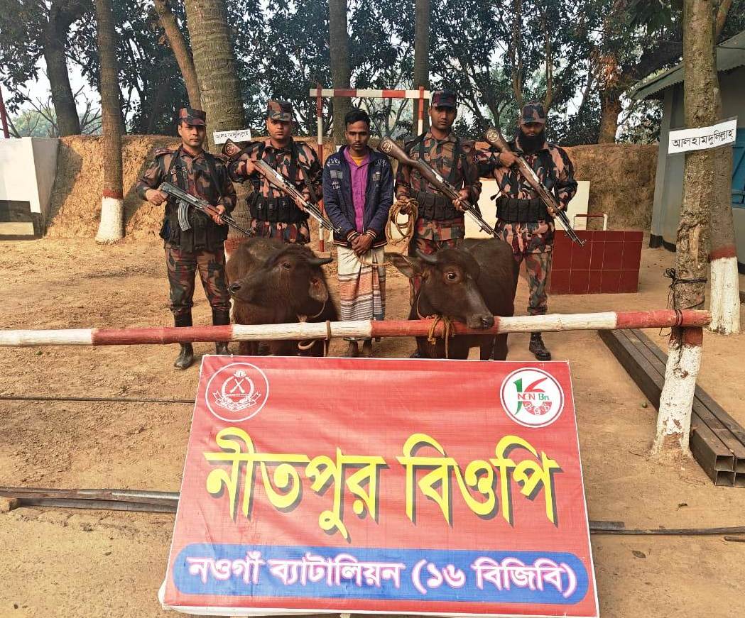 নওগাঁর পোরশার নীতপুর সীমান্তে এক চোরাকারবারী সহ একজোড়া ভারতীয় মহিষ আটক করেছে নওগাঁ ব্যাটালিয়ন (১৬ বিজিবি) নিতপুর বিওপির সদস্যরা। শুক্রবার সকাল আনুমানিক ৬টায় নিতপুর বিওপির টহল কমান্ডার হাবিলদার ইলিয়াস এর নেতৃত্বে একটি বিশেষ টহল দল ভূট্টা পাড়া গ্রামের বালুভাঙ্গা মাঠে অভিযান পরিচালনা করে মিজাইল (৩৫)কে একজোড়া ভারতীয় মহিষসহ আটক করা হয়। আটক মিজাইল কালাইবাড়ি ভুট্টাপাড়া গ্রামের বজলুর রহমানের ছেলে। মহিষসহ আটক মিজাইলকে শুক্রবার পোরশা থানায় হস্তান্তর করা হয়েছে। বিষয়টি নিশ্চিত করে ১৬বিজিবি নওগাঁ ব্যাটালিয়নের অধিনায়ক লেঃ কর্নেল মোহাম্মদ আরিফুল ইসলাম মাসুম, পিএসসি জানান, নওগাঁ ও চাঁপাইনবাবগঞ্জ সীমান্তে গরু, মাদক পাচার, অবৈধ সীমান্ত পারাপার এবং চোরাচালানের বিরুদ্ধে সর্বাত্বক অভিযান অব্যাহত রয়েছে। যা চলমান থাকবে।
