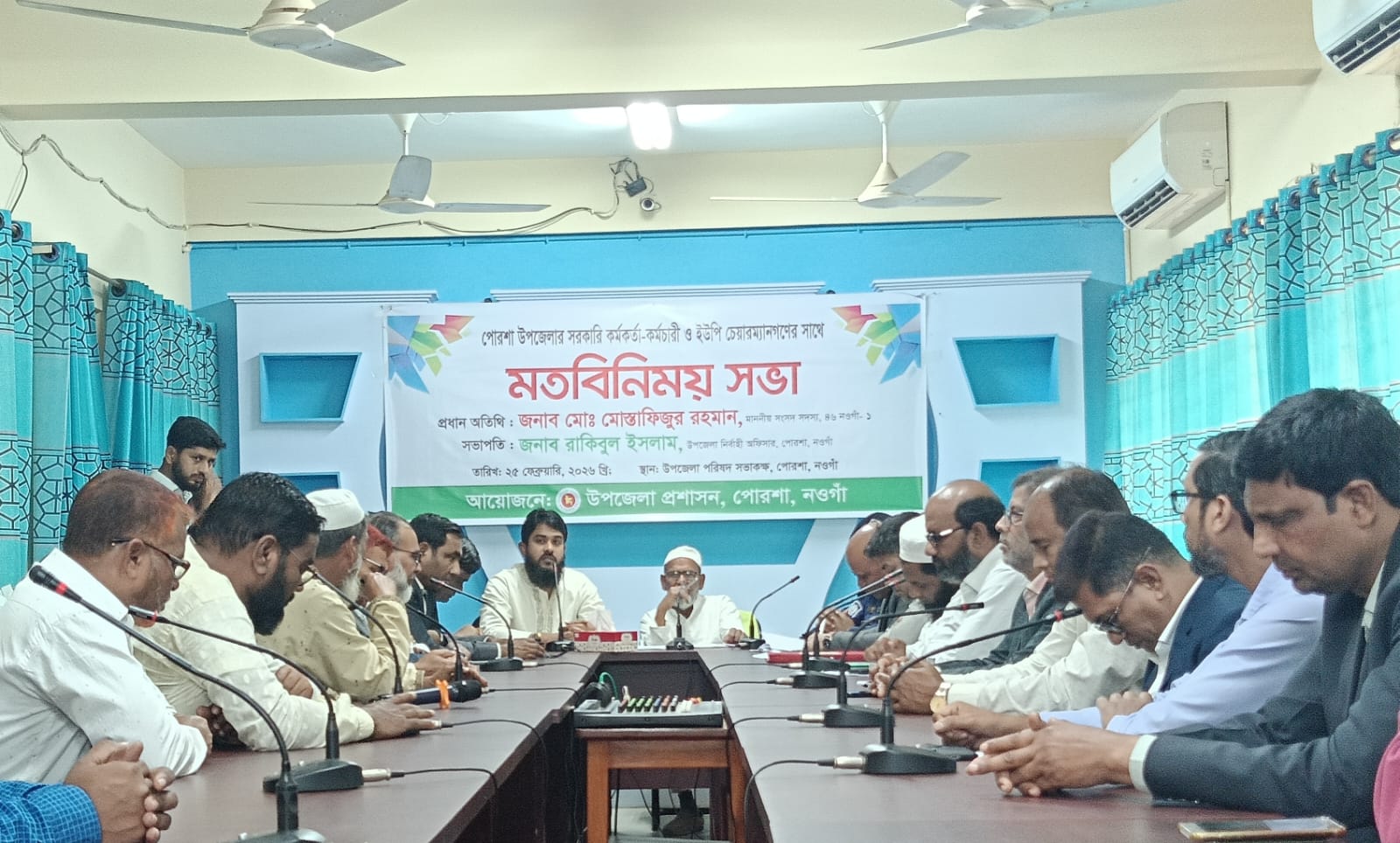 পোরশা(নওগাঁ)প্রতিনিধি: নওগাঁর পোরশা উপজেলা পর্যায়ের কর্মকর্তা-কর্মচারী ও ইউপি চেয়ারম্যান গণের সাথে মতবিনিময় করেছেন ৪৬ নওগাঁ-১ আসনে নবনির্বাচিত সংসদ সদস্য মোঃ মোস্তাফিজুর রহমান। বুধবার উপজেলা পরিষদ মিলনায়তনে উপজেলা প্রাশাসনের আয়োজনে সভায় সভাপতিত্ব করেন ইউএনও রাকিবুল ইসলাম। প্রধান অতিথি ছিলেন ৪৬ নওগাঁ-১ (নিয়ামতপুর-পোরশা-সাপাহার) আসনের সংসদ সদস্য মোঃ মোস্তাফিজুর রহমান। এ সময় কৃষি কর্মকর্তা মামুনুর রশিদ, প্রাণি সম্পদ কর্মকর্তা ডাঃ জাহাঙ্গীর আলম, থানা অফিসার ইনচার্জ জিয়াউর রহমান, এলজিআরডি প্রকৌশলী এএনএম সুলতানুল ইমাম, প্রকল্প বাস্তবায়ন কর্মকর্তা মাহমুদুল হক টিটু, সমাজসেবা কর্মকর্তা শহিদুল ইসলামসহ কর্মকর্তা ও বিভিন্ন ইউপির প্যানেল চেয়ারম্যানগণ, উপজেলা বিএনপির সাবেক সিনিয়র সহসভাপতি তৌফিকুর রহমান চৌধুরী, সাধারন সম্পাদক সাদেকুল ইসলাম, যুবদল আহবায়ক ইকবাল শাহ্ চৌধুরী সহ স্থানীয় বিএনপির নেতৃবৃন্দ উপস্থিত ছিলেন। মতবিনিময় সভায় প্রধান অতিথি সংসদ সদস্য মোঃ মোস্তাফিজুর রহমান উপজেলার বিভিন্ন দপ্তরে চলমান কার্যক্রম, সমস্যা ও সম্ভাবনা নিয়ে আলোচনা করেন। শিক্ষা, স্বাস্থ্য, কৃষি, ভূমি ব্যবস্থাপনা, অবকাঠামো উন্নয়ন এবং জনসেবামূলক কার্যক্রমকে আরও গতিশীল ও কার্যকর করার উপরও গুরুত্বারোপ করা হয়। তিনি এ উপজেলার উন্নয়নকে টেকসই ও জনকল্যাণমুখী করতে সকল দপ্তরের সমন্বিত প্রচেষ্টা অব্যাহত রাখা এবং স্বচ্ছতা, জবাবদিহিতা ও আন্তরিকতার সঙ্গে জনগণের সেবা নিশ্চিত করার আহ্বান জানান। পাশাপাশি তিনি প্রধানমন্ত্রী তারেক রহমানের নতুন ও সম্ভাবনাময় উদ্যোগ গ্রহণের আলোকে সরকারের উন্নয়ন পরিকল্পনা বাস্তবায়নের জন্য জনপ্রতিনিধি ও স্থানীয় প্রশাসনের মধ্যে সমন্বিতভাবে কাজ করার আহবান জানান। পরে বিকালে তিনি উপজেলা পরিষদের মাসিক সমন্বয় সভায় যোগদান করেন। এর আগে প্রধান অতিথি সংসদ সদস্য মোঃ মোস্তাফিজুর রহমান উপজেলা প্রাথমিক শিক্ষা পরিবারের পক্ষ থেকে দেওয়া ক্রেস্ট গ্রহণ করেন এবং উপস্থিত শিক্ষকগণকে ধন্যবাদ জানান। । এছাড়াও একইদিন তিনি উপজেলা স্বাস্থ্য কমপ্লেক্সে ডেন্টাল চিকিৎসা কার্যক্রমের উদ্বোধন করেন।