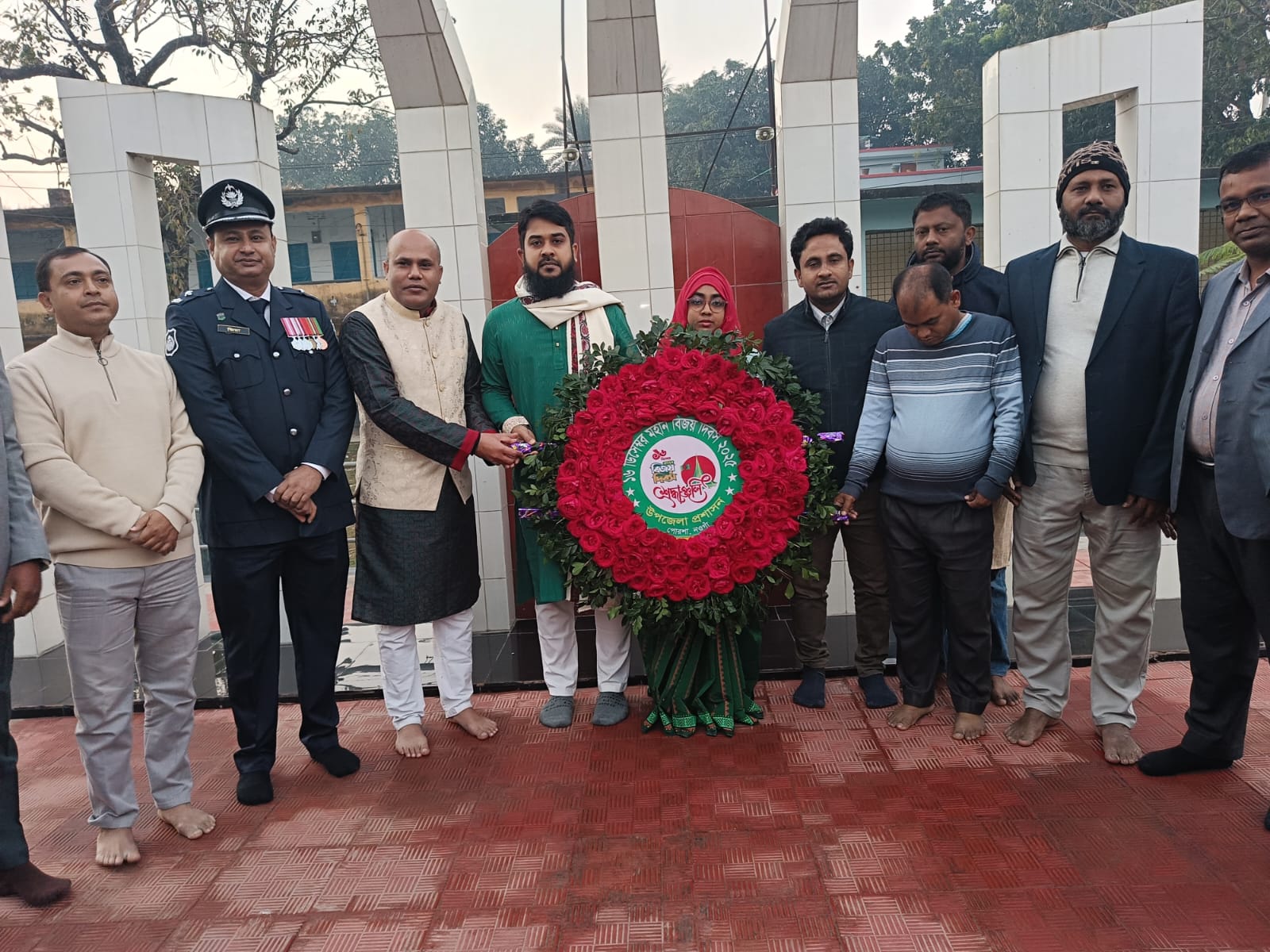 পোরশা(নওগাঁ)প্রতিনিধি: নওগাঁর পোরশায় যথাযোগ্য মর্যাদায় মহান বিজয় দিবস বিভিন্ন কর্মসূচির মধ্য দিয়ে উদ্যাপন করা হয়েছে। মঙ্গলবার দিবসটিতে সূর্যোদয়ের সাথে সাথে উপজেলা চত্বরে ৩১বার তোপধ্বনীর মাধ্যমে দিনটির সূচনা হয়। পরে একই সময়ে উপজেলা প্রশাসনের পক্ষে ইউএনও রাকিবুল ইসলাম বিভিন্ন দপ্তরের কর্মকর্তাদের নিয়ে আনুষ্ঠানিকভাবে জাতীয় পতাকা উত্তোলন ও কেন্দ্রিয় শহিদ মিনারে পুস্পস্তবক অর্পণ করেন। এছাড়াও দিবসটিতে নিতপুর সরকারি মডেল উচ্চ বিদ্যালয় ও কলেজ মাঠে উপজেলা প্রশাসনের আয়োজনে মহান বিজয় দিবস ও বিজয় মেলার উদ্বোধন, কুচকাওয়াজ, ডিসপ্লে প্রদর্শন, বীর মুক্তিযোদ্ধা, যুদ্ধাহত বীর মুক্তিযোদ্ধা এবং শহীদ মুক্তিযোদ্ধা পরিবারের সদস্যদের সংবর্ধনা, হাসপাতাল, সরকারি, বেসরকারি শিশু সদন, এতিখনায় উন্নতমানের খাবার পরিবেশন, মসজিদে দোয়া ও মন্দিরে প্রার্থনা, মুক্তিযুদ্ধ ভিত্তিক প্রামাণ্য চিত্র প্রদর্শন এবং সাংস্কৃতিক অনুষ্ঠান অনুষ্ঠিত হয়। অনুষ্ঠান গুলিতে প্রধান অতিথি ছিলেন ইউএনও রাকিবুল ইসলাম। এসময় সহকারি কমিশনার (ভূমি) নাবিলা ফেরদৌস, থানা অফিসার ইনচার্জ জিয়াউর রহমান, প্রাণী সম্পদ কর্মকর্তা ডাঃ জাহাঙ্গীর আলম, প্রাথমিক শিক্ষা কর্মকর্তা সাজ্জাদ হোসেন, প্রকল্প বাস্তবায়ন কর্মকর্তা মাহমুদুল হক টিটো, থানা অফিসার ইনচার্জ (তদন্ত) শাহ্ আলম সরদার, হিসাব রক্ণ কর্মকর্তা ওয়াকিউল ইসলাম, পল্লী বিদ্যুৎ নওগাঁ-১ পোরশা জোনের ডিজিএম মহিউদ্দিন, সমাজসেবা কর্মকর্তা শহিদুল ইসলাম, ইউআরসি ইন্সিট্রাক্টর আশরাফুল আলম সহ বিভিন্ন কর্মকর্তা গণ উপস্থিত ছিলেন। অপরদিকে, উপজেলা বিএনপির সাধারন সম্পাদক সাদেকুল ইসলামের নেতৃত্বে শহিদ মিনরে পুস্পস্তবক অর্পণ করা হয়। অপরদিকে সাবেক সাংগঠনিক সম্পাদক আজাহার আলীর নেতৃত্বে বিএনপির নেতাকর্মীরা শহিদ মিনারে পুস্পস্তবক অর্পণ করেন। এছাড়াও মাধ্যমিক শিক্ষক সমিতি সহ বিভিন্ন শিক্ষা প্রতিষ্ঠান ও রাজনৈতিক দল দিবসটিতে নানা কর্মসূচি পালন করেন।