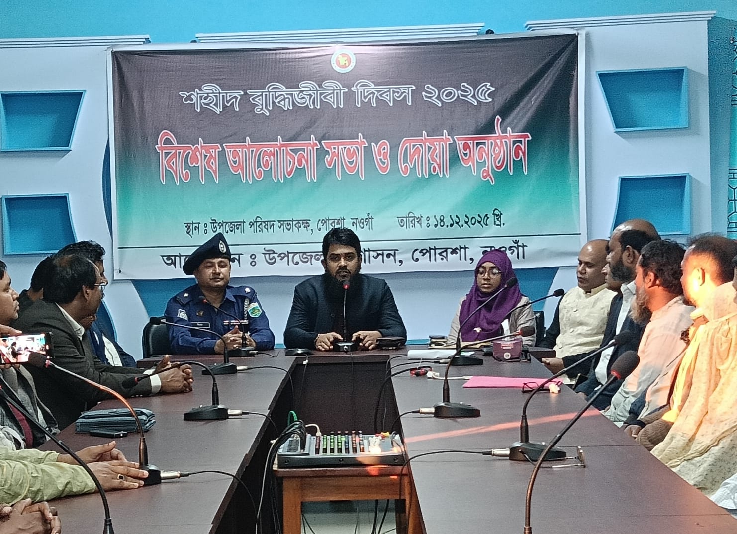 নওগাঁর পোরশায় শহীদ বুদ্ধিজীবী দিবস পালন করা হয়েছে। দিবসটি উপলক্ষে রোববার বিকালে উপজেলা প্রশাসনের আয়োজনে উপজেলা পরিষদ হলরুমে এক আলোচনা সভা ও দোয়া অনুষ্ঠিত হয়। এতে সভাপতিত্ব করেন ইউএনও রাকিবুল ইসলাম। এসময় উপজেলা সহকারী কমিশনার (ভূমি) মোসা: নাবিলা ফেরদাউস, কৃষি কর্মকর্তা মামুনুর রশিদ, প্রাণিসম্পদ কর্মকর্তা জাহাঙ্গীর আলম, থানা অফিসার ইনচার্জ জিয়াউর রহমান, সমাজসেবা কর্মকর্তা শহিদুল ইসলাম, প্রাথমিক শিক্ষা কর্মকর্তা সাজ্জাদ হোসেন, ইউআরসি ইন্সট্রক্টর আশরাফুল আলম সহ বিভিন্ন দপ্তরের কর্মকর্তা বৃন্দ। আলোচনায় বক্তারা বলেন, ১৯৭১ সালের ১৪ ডিসেম্বর পাকিস্তানি হানাদার বাহিনী ও তাদের এদেশীয় দোসররা পরিকল্পিতভাবে দেশের শ্রেষ্ঠ সন্তান বুদ্ধিজীবীদের হত্যা করে জাতিকে মেধাশূন্য করার অপচেষ্টা চালায়। শহীদ বুদ্ধিজীবীদের আত্মত্যাগের বিনিময়েই আজকের স্বাধীন বাংলাদেশ। তাদের আদর্শ ও দেশপ্রেম থেকে শিক্ষা নিয়ে আগামীর বাংলাদেশ গড়ে তুলতে সবাইকে ঐক্যবদ্ধভাবে কাজ করার আহ্বান জানান বক্তারা। সভা শেষে শহীদ বুদ্ধিজীবীদের আত্মার মাগফেরাত কামনায় বিশেষ দোয়া ও মোনাজাত করা হয়।