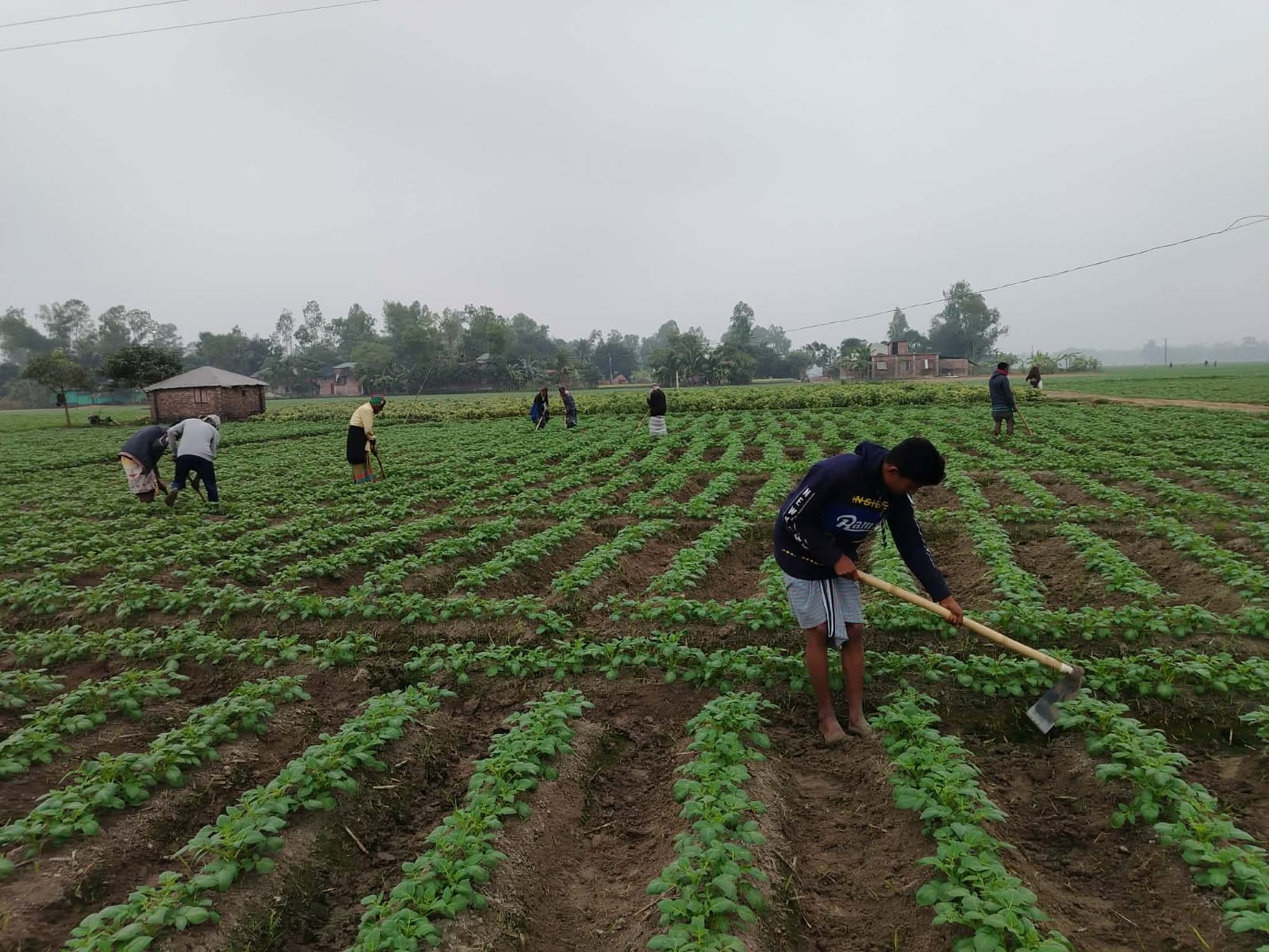 বগুড়ার শেরপুর উপজেলায় এবার আলুর বাম্পার ফলনের আশায় কৃষকরা আলু গাছের পরিচর্যায় ব্যস্ত সময় পার করছেন। উপজেলায় আলুক্ষেতে সকাল থেকে সন্ধ্যা পর্যন্ত কাজ করছেন চাষিরা। সেচ দেওয়া, আগাছা পরিষ্কার, কীটনাশক স্প্রে ও মাটি দিয়ে বেধেঁ দেয়া সহ নানা কাজে ব্যাস্ত সময় পার করছেন শেরপুরের কৃষকেরা। উপজেলা কৃষি সম্প্রসারন অফিস সূত্রে জানা গেছে, চলতি মৌসুমে শেরপুরে লক্ষ্যমাত্রার চেয়ে বেশি জমিতে আলু চাষ হয়েছে। গত বছরে বড় ধরনের লোকসান, এবারে সার সংকট সহ নানা প্রতিকূলতাকে পিছনে ফেলে শেরপুরের কৃষকরা আলুর জমি পরিচর্যায় চাষে ব্যস্ত। সরেজমিনে দেখা যায় উপজেলার কুসুম্বি ইউনিয়নের খিকিন্দা, চন্ডেশ্বর, উত্তর পেঁচুল, আকরামপুর, মির্জাপুর ইউনিয়নের মাখাইলচাপড়, তালতাসহ বিভিন্ন গ্রামের পর গ্রাম, একরের পর একর জমিতে শুধু আলুর চাষ। প্রতিদিন কয়েক হাজার পুরুষ শ্রমিক ৭শ থেকে ৮শ টাকা মজুরি ভিত্তিতে এই কাজগুলো কাজ করছেন। অপরদিকে এই উপজেলার যারা আগাম আলু চাষ করেছিলেন তারা বাজারজাতের জন্য জমি থেকে আলু উত্তোলন করছেন, তবে তারা দাম নিয়ে একেবারেই হতাশ হয়ে পড়েছেন। আগাম আলু চাষ করা কৃষক আমজাদ বলেন, গত বছরের লোকসান কাটিয়ে উঠতে এবার ২ বিঘা জমিতে আগাম আলু রোপন করেছিলাম কিন্তু দাম পড়ে যাওয়ায় এবারো লোকসানের মুখোমুখি হতে হচ্ছে। পাইকারি বাজারে বর্তমানে নতুন আলু ৩০/৪০ টাকা কেজি দরে বিক্রি করতে হচ্ছে। উপজেলা কৃষি সম্প্রসারণ অফিস সূত্রে জানা যায়, এ বছর আলু চাষের লক্ষ্যমাত্রা নির্ধারণ করা হয়েছে ২ হাজার ৫শ হেক্টর জমি কিন্তু বাস্তবে এর চাইতে অনেক বেশি পরিমান জমিতে আলুর চাষ হয়েছে। মির্জাপুর ইউনিয়নের মাধাইল চাপড় গ্রামের কৃষক জাহাঙ্গীর হোসেন বলেন, গত বছর ১শ ৫০ বিঘা জমিতে আলু চাষ করে প্রায় ৭০ লাখ টাকা লোকসান হয়েছে, আশা করছি এবার সেই লোকসান পুষিয়ে উঠবে। তবে আশংকায় আছি আলুর দাম নিয়ে, কেননা এবারে আগাম জাতের নতুন আলুর দাম পড়ে গেছে। উপজেলার কুসুম্বি ইউনয়নের উত্তর পেঁচুল গ্রামের কৃষক জেল হক, ফরিদ হোসেন , খিকিন্দা গ্রামের ফারুক হোসেন বলেন, আমরা একেকজন ১০ থেকে ২৫ বিঘা আলুর চাষ করেছি। এখন গাছ পরিচর্যায় ব্যস্ত সময় যাচ্ছে। আশা করছি এবার আলুম দাম প্রত্যাশিত থাকবে। অন্যান্য ফসলের চাইতে তুলনামুলক আলু লাভবেশি। এক একর জমিতে আলু বীজ ক্রয়, রোপন, সার প্রয়োগ, সেচ ও শ্রমিকসহ খরচ হয় ১ লাখ ৫০ হাজার টাকা থেকে ১ লাখ ৮০ হাজার টাকা খরচ হয়। বাজারে আলুর দাম স্বাভাবিক থাকলে খরচ বাদ দিয়ে একর প্রতি ৭০ হাজার থেকে ৮০ হাজার টাকা লাভ হয়। গত বছর আলুচাষ করে ক্ষতিগ্রন্থ হলেও আশা করছি এবার ভাল দামে বিক্রি করতে পারবো। এখন গাছের যে চেহারা তাতে আবহাওয়া অনুকুলে থাকলে বাম্পার ফলন পাব বলে আশা করছি।এ প