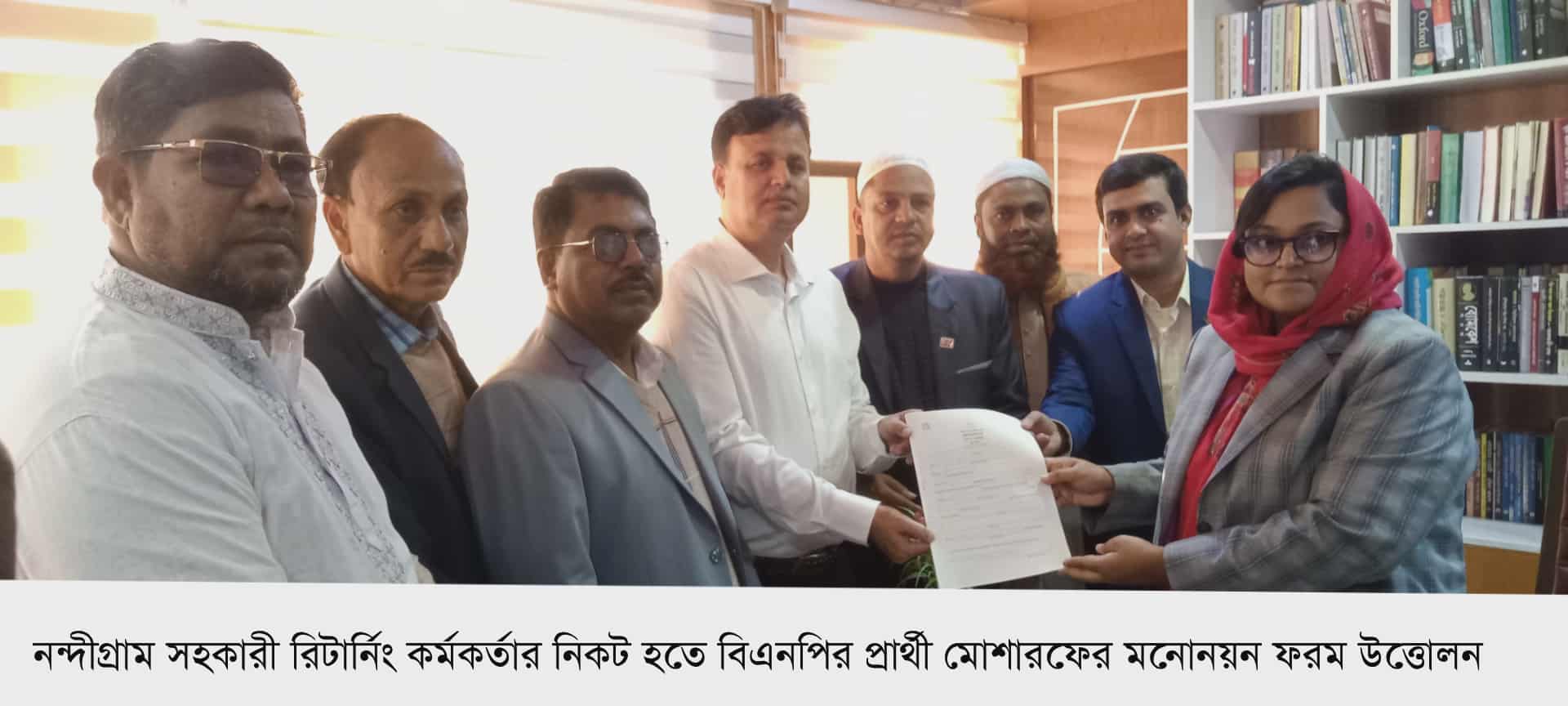 আসন্ন ত্রয়োদশ জাতীয় সংসদ নির্বাচনকে সামনে রেখে বগুড়ার নন্দীগ্রামে গত ২২শে ডিসেম্বর (সোমবার) বেলা আড়াইটায় বগুড়া-৪ (কাহালু-নন্দীগ্রাম) আসনে বাংলাদেশ জাতীয়তাবাদী দল (বিএনপি) মনোনীত ধানের শীষ প্রতীকের প্রার্থী সাবেক এমপি আলহাজ্ব মোঃ মোশারফ হোসেন দলীয় নেতা-কর্মীদের সাথে নিয়ে সহকারী রিটার্নিং কর্মকর্তা ও নন্দীগ্রাম উপজেলা নির্বাহী অফিসার শারমিন আরা এবং উপজেলা নির্বাচন কর্মকর্তা মোঃ তাজুল ইসলামের নিকট হতে মনোনয়ন ফরম উত্তোলন করেন। মনোনয়ন ফরম উত্তোলন কালে উপস্থিত ছিলেন নন্দীগ্রাম উপজেলা বিএনপির সভাপতি মোঃ আলাউদ্দিন সরকার, সাধারণ সম্পাদক মোঃ বেলায়েত হোসেন আদর, নন্দীগ্রাম পৌর বিএনপির সভাপতি মোঃ আলেকজান্ডার, সাধারণ সম্পাদক কে, এম শফিউল আলম সুমন, নন্দীগ্রাম পৌর কৃষক দলের সভাপতি সাবেক মেয়র সুশান্ত কুমার সরকার শান্ত প্রমুখ। এবিষয়ে সহকারী রিটার্নিং কর্মকর্তা শারমিন আরা নির্বাচন কমিশন ঘোষিত প্রার্থীদের জন্য আচরণ বিধিমালা যথায মেনে চলার জন্য অনুরোধ করেন।