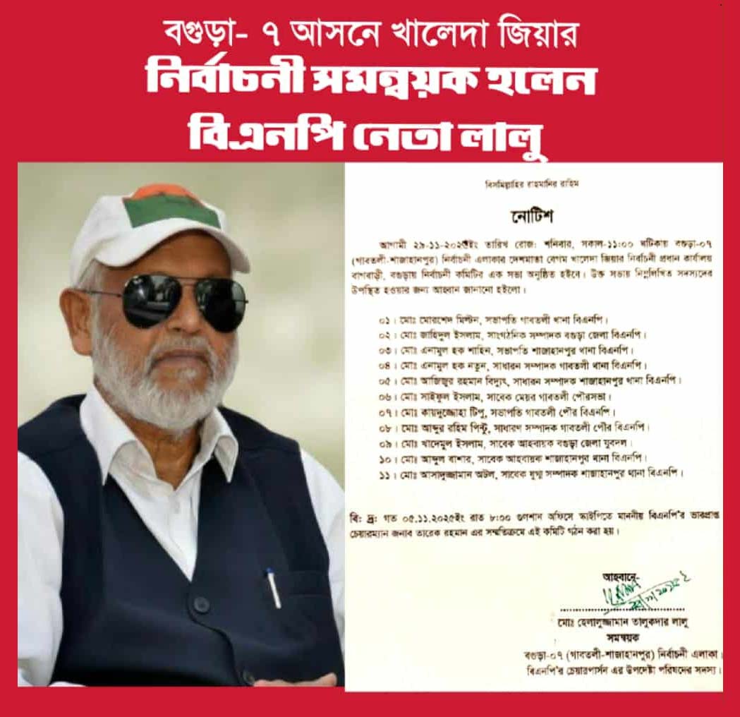 বাংলার গৌরব ডেক্সঃ বিএনপি চেয়ারপার্সনের উপদেষ্টা পরিষদের সদস্য হেলালুজ্জামান তালুকদার লালুকে বগুড়া-০৭ (গাবতলী-শাজাহানপুর) আসনের নির্বাচনী সমন্বয়ক হিসেবে মনোনয়ন দেওয়া হয়েছে। দলের ভারপ্রাপ্ত চেয়ারম্যান তারেক রহমানের সম্মতিতেই এ সমন্বয়কারী কমিটি গঠন করা হয় বলে জানা গেছে। গত ৫ নভেম্বর ২০২৫, রাত ৮টায় গুলশান কার্যালয়ে স্কাইপির মাধ্যমে অনুষ্ঠিত সভায় তারেক রহমান কমিটির অনুমোদন দেন। এ কমিটিকে কেন্দ্র করে আগামী ২৯ নভেম্বর ২০২৫, শনিবার সকাল ১১টায় বগুড়ার বাগবাড়ীস্থ দেশমাতা বেগম খালেদা জিয়ার নির্বাচনী প্রধান কার্যালয়ে গুরুত্বপূর্ণ সভা আহ্বান করা হয়েছে। সভায় উপস্থিত থাকার জন্য গাবতলী ও শাজাহানপুর থানাসহ জেলা বিএনপি, পৌর বিএনপি ও সহযোগী সংগঠনের ১১ জন শীর্ষ নেতার নাম উল্লেখ করে আনুষ্ঠানিক নোটিশ জারি করা হয়েছে। কমিটির শীর্ষ পর্যায়ের সদস্যরা হলেন, গাবতলী থানা বিএনপির সভাপতি মোর্শেদ মিল্টন, বগুড়া জেলা বিএনপির সাংগঠনিক সম্পাদক জাহিদুল ইসলাম, শাজাহানপুর থানা বিএনপির সভাপতি এনামুল হক শাহিন, গাবতলী থানা বিএনপির সাধারণ সম্পাদক এনামুল হক নতুন, শাজাহানপুর থানা বিএনপির সাধারণ সম্পাদক আজিজুর রহমান বিদ্যুৎ, গাবতলী পৌরসভার সাবেক মেয়র সাইফুল ইসলাম, গাবতলী পৌর বিএনপির সভাপতি কায়দুজ্জোহা টিপু, গাবতলী পৌর বিএনপির সাধারণ সম্পাদক আব্দুর রহিম পিন্টু, বগুড়া জেলা যুবদলের সাবেক আহ্বায়ক খাদেমুল ইসলাম, শাজাহানপুর থানা বিএনপির সাবেক আহ্বায়ক আব্দুল বাশার, শাজাহানপুর থানা বিএনপির সাবেক যুগ্ম সম্পাদক আসাদুজ্জামান অটল। দলের বিভিন্ন পর্যায়ের নেতারা মনে করছেন, অভিজ্ঞ রাজনীতিক হিসেবে পরিচিত হেলালুজ্জামান তালুকদার লালুর দায়িত্ব গ্রহণে বগুড়া-৭ আসনের নির্বাচনী কার্যক্রমে নতুন গতি আসবে। নির্বাচনী মাঠ গোছাতে তাঁর নেতৃত্বই হবে কেন্দ্রীয় কৌশলের প্রধান অংশ। দলীয় সূত্র বলছে, উচ্চপর্যায়ের সম্মতিতে গঠিত এ কমিটি আসন্ন জাতীয় নির্বাচনে বগুড়া-৭ আসনে বিএনপির সাংগঠনিক প্রস্তুতি আরও সুদৃঢ় করবে।