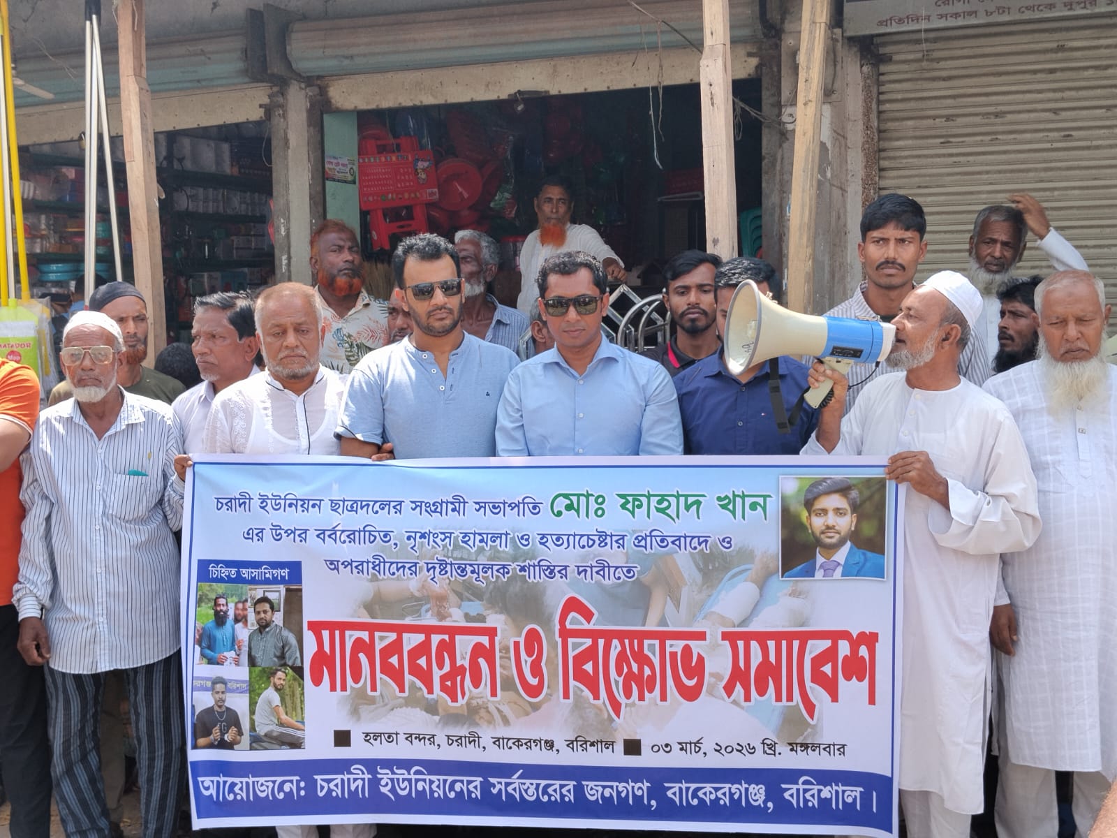 বরিশালের বাকেরগঞ্জ উপজেলার চরাদি ইউনিয়ন ছাত্রদল সভাপতি ফাহাদ খানকে (৩০) হত্যাচেষ্টার ঘটনায় মানববন্ধন করা হয়েছে।