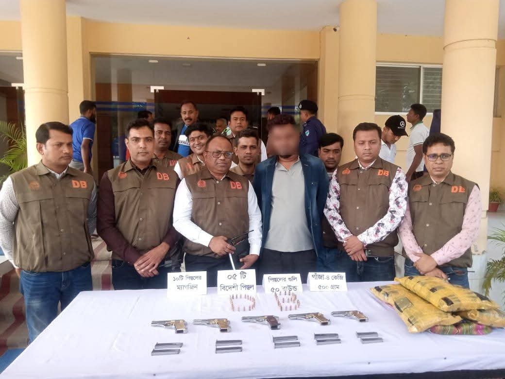 লিটন গাজী (৩৮), পিতা—নুর ইসলাম গাজী, মাতা—রহিমা বেগম, সাং—সুজলপুর/মধুগ্রাম, থানা—কোতয়ালী, জেলা যশোর। অভিযানে ৫টি 7.65MM বিদেশী পিস্তল, ১০টি পিস্তলের ম্যাগজিন, ৫০ রাউন্ড গুলি ও ৪ কেজি ৫০০ গ্রাম গাঁজা উদ্ধার করা হয়।