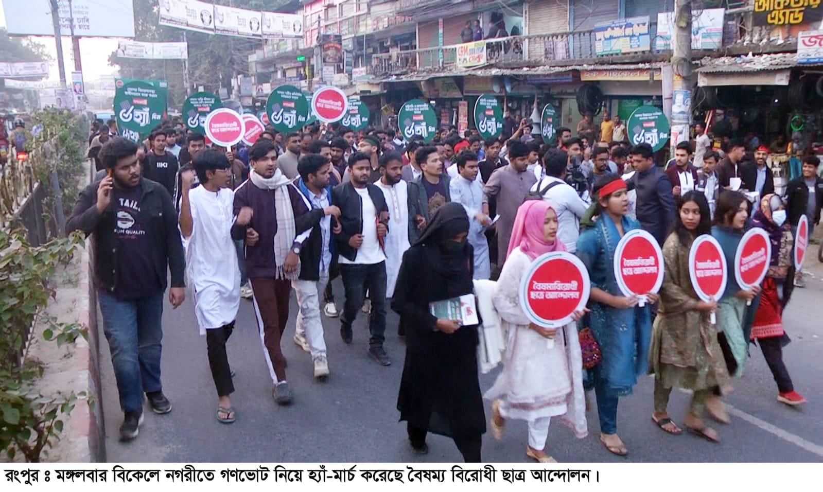 রংপুরে গণভোট নিয়ে হ্যাঁ-মার্চ করেছে বৈষম্য বিরোধী ছাত্র আন্দোলন। মঙ্গলবার (৩ ফেব্রুয়ারী) বিকেলে নগরীর পাবলিক লাইব্রেরী মাঠে গণভোটের প্রচারণা ভ্যানে হ্যাঁ এর পক্ষে ডকুমেন্টরী প্রদর্শন করা হয়। এরপর বৈষম্য বিরোধী ছাত্র আন্দোলন কেন্দ্রীয় কমিটির সভাপতি রিফাত রশীদ ও মুখ্য সমন্বয়ক আসিফ আল ইসলামের নেতৃত্বে একটি প্রচারণা র্যালী নগরীর গুরুত্বপূর্ণ সড়ক প্রদক্ষিণ করে। এ সময় ত্রয়োদশ জাতীয় সংসদ নির্বাচনে জুলাই অভ্যূত্থানের কাঙ্খিত বাংলাদেশ গড়তে হ্যাঁ এর পক্ষে রায় দেয়ার আহ্বান জানানো হয়।