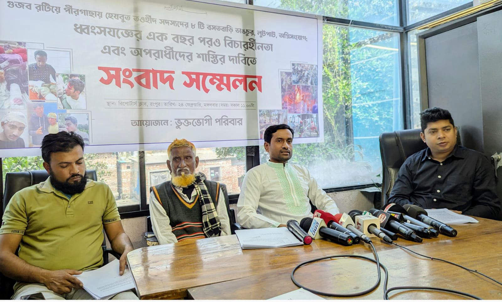 রংপুর পীরগাছার ছিদামহাট এলাকায় গুজব রটিয়ে মব সৃষ্টি করে ৮টি ঘরবাড়ি ভাংচুর, লুটপাট ও অগ্নিসংযোগের মামলার এক বছরেও বিচার না পাওয়ায় সংবাদ সম্মেলন করেছে ভুক্তভোগী পরিবার। মঙ্গলবার (২৪ ফেব্রুয়ারী) দুপুরে রংপুর রিপোর্টার্স ক্লাব মিলনায়তনে লিখিত বক্তব্যে ভুক্তভোগী হেযবুত তাওহীদের বিভাগীয় কমিটির সভাপতি আব্দুল কুদ্দুস শামীম জানান, ২০২৫ সালের ২৪ ফেব্রুয়ারী সংগঠক শামীম স্থানীয় প্রশাসনকে অবগত করে নিজ বাড়িতে সংগঠনের সদস্যদের নিয়ে প্রীতিভোজের আয়োজন করে। ওইদিন জামায়াতের কতিপয় নেতাকর্মী গুজব রটিয়ে হেযবুত তাওহীদের সদস্যদের লাঠিসোটা, রামদা, কুড়াল দিয়ে হামলা করে ১৫ জনকে গুরুতর আহত করে। সেই সাথে ২৩টি মোটরসাইকেল পুড়িয়ে দেয়া, ১২টি ফ্রিজিয়ান জাতের গরু চুরি করে। এনিয়ে ভূক্তভোগীরা থানায় একটি ও আদালতে ৫টি মামলা করে। সম্প্রতি আদালতে করা একটি মামলার আসামীদের বিরুদ্ধে গ্রেফতারী পরোয়ানা জারী হলে আসামীরা ভুক্তভোগীদের প্রাণনাশের হুমকি দিয়ে যাচ্ছে।