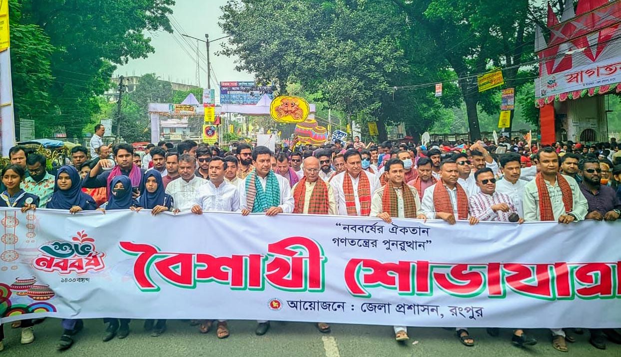 এ সময় বক্তারা বলেন, শিক্ষার্থীদের সাংষ্কৃতিক পরিবেশনার মাধ্যমে আবহমান বাংলার কৃষ্টি, সংস্কৃতিকে তুলে ধরা হচ্ছে। নতুন বছরের প্রথম দিনে দল, মত, ভেদাভেদ ভূলে গিয়ে সুখী-সমৃদ্ধ, কল্যাণমুখী রাষ্ট্র গঠনে সকলকে ঐক্যবদ্ধভাবে কাজ করতে হবে। দেশের সম্পদের সুষম বন্টন নিশ্চিত করতে হবে। এরপর গ্রাম বাংলার চিরচেনা ঐতিহ্যের রঙ্গীন আবহে জিলা স্কুল থেকে একটি বৈশাখী র্যালী বের হয়ে নগরীর গুরুত্বপূর্ণ সড়ক প্রদক্ষিণ করে। এদিকে বাংলা নববর্ষকে ঘিরে সম্মিলিত সাংস্কৃতিক ঐক্য পরিষদ পাবলিক লাইব্রেরী মাঠে তিনদিনব্যাপী সাংস্কৃতিক উৎসব পালন করছে। এছাড়া রংপুর বেগম রোকেয়া বিশ^বিদ্যালয়, কারমাইকেল কলেজসহ বিভিন্ন শিক্ষাপ্রতিষ্ঠান ও সংগঠন পৃথক পৃথকভাবে বাংলা নববর্ষ উদযাপন করছে।