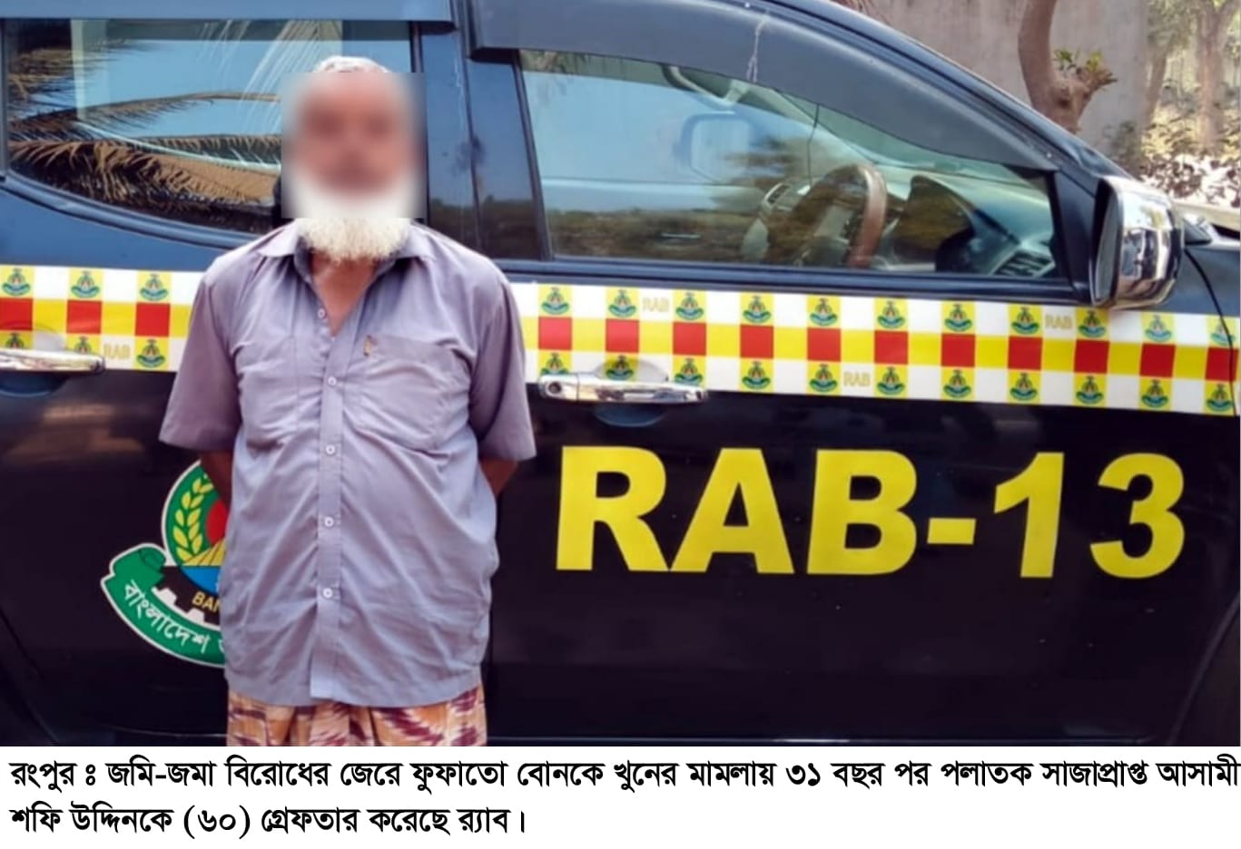 তিনি জানান, ১৯৯৫ সালে জমি-জমা সংক্রান্ত বিরোধের জেরে শফি উদ্দিন তার ফুফাতে বোনকে খুন করে। এনিয়ে মিঠাপুকুর থানায় মামলা হয় এবং পরবর্তীতে সাক্ষ্য-প্রমাণ শেষে আদালত আসামী শফি উদ্দিনের মৃত্যুদন্ড রায় দেন। হত্যাকান্ডের পর থেকে আইন শৃঙ্খলা বাহিনীকে ফাঁকি দিয়ে আসামী শফি উদ্দিন বদরগঞ্জ উপজেলায় বসবাস করতে থাকেন। সম্প্রতি আদালতের রায় বাস্তবায়নে পরিবারের পক্ষ থেকে আইন শৃঙ্খলা বাহিনীর সাথে যোগাযোগ করা হয়। বিষয়টি র্যাব অবগত হয়ে বৃহস্পতিবার বদরগঞ্জে অভিযান চালিয়ে পলাতক সাজাপ্রাপ্ত আসামী শফিকে মামলার ৩১ বছর পর গ্রেফতার করে। র্যাব-১৩ এর সিনিয়র সহকারী পরিচালক বিপ্লব কুমার গোস্বামী বলেন, সাজাপ্রাপ্ত আসামী শফির বিরুদ্ধে পরবর্তী আইনানুগ ব্যবস্থা গ্রহণে সংশ্লিষ্ট থানায় হস্তাস্তর করা হয়েছে।