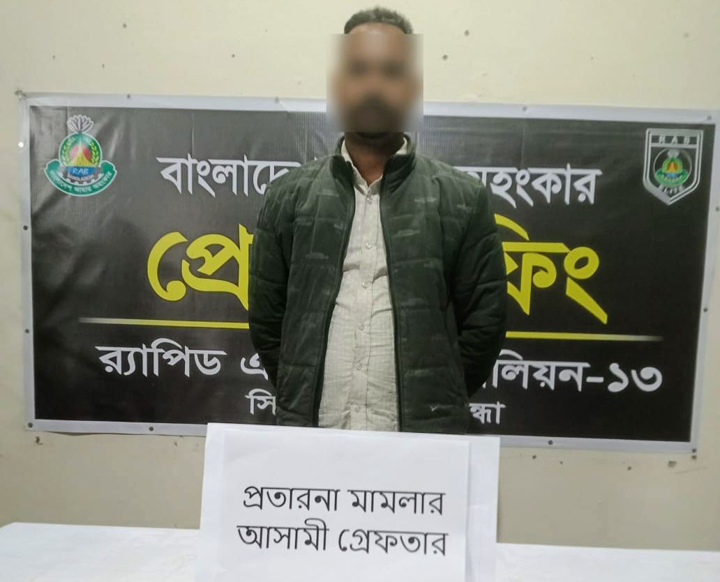রংপুর র্যাবের অভিযানে সেনা ও র্যাব সদস্য পরিচয় দিয়ে প্রতারণার অভিযোগে আল আমিন (২৭) নামে এক যুবককে গ্রেফতার করা হয়েছে। শুক্রবার (৬ ফেব্রুয়ারী) দিবাগত রাত পৌণে ২টায় গাইবান্ধা সদর উপজেলার দক্ষিণ ধানঘড়া এলাকা থেকে তাকে গ্রেফতার করা হয়। আল আমিন কুড়িগ্রামের উলিপুর উপজেলার নারিকেলবাড়ি এলাকার আশরাফুল ইসলামের ছেলে। পরবর্তী আইনী ব্যবস্থা গ্রহণের জন্য আল আমিনকে সংশ্লিষ্ট থানায় হস্তান্তর করেছে র্যাব। শনিবার দুপুরে এ তথ্য নিশ্চিত করেছেন র্যাব-১৩ এর সহকারী পরিচালক বিপ্লব কুমার গোস্বামী।