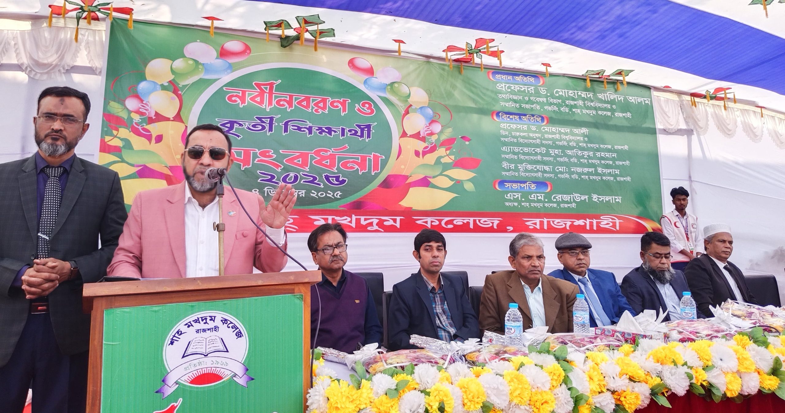রাজশাহীতে শাহ্ মখদুম কলেজে উৎসবমুখর পরিবেশে নবীনবরণ অনুষ্ঠান অনুষ্ঠিত হয়েছে। বৃহস্পতিবার (৪ ডিসেম্বর) সকাল থেকে কলেজ প্রাঙ্গণে আয়োজিত এ অনুষ্ঠানে নতুন শিক্ষার্থীদের বরণ করে নেওয়া হয় ফুল দিয়ে। এর আগে বিএনপির চেয়ারপারসন ও সাবেক প্রধানমন্ত্রী বেগম খালেদা জিয়ার রোগমুক্তি কামনায় দোয়া মাহফিল অনুষ্ঠিত হয়। সকাল ১০টায় অনুষ্ঠিত নবীনবরণে প্রধান অতিথি হিসেবে উপস্থিত ছিলেন কলেজের গভর্নিং বডির সভাপতি ও রাজশাহী বিশ্ববিদ্যালয়ের প্রফেসর ড. মোহাম্মদ খালিদ আলম। নবাগত শিক্ষার্থীদের উদ্দেশে তিনি বলেন, “শিক্ষাজীবনের এই নতুন যাত্রা হবে দায়িত্ব, শৃঙ্খলা এবং মানবিক মূল্যবোধে পরিপূর্ণ। সুনাগরিক হিসেবে গড়ে ওঠার জন্য এখন থেকেই আত্মনিয়োগ করতে হবে। নিয়মিত ক্লাস, অধ্যবসায় ও সময়কে যথাযথ কাজে লাগানোই সফলতার মূল চাবিকাঠি।”