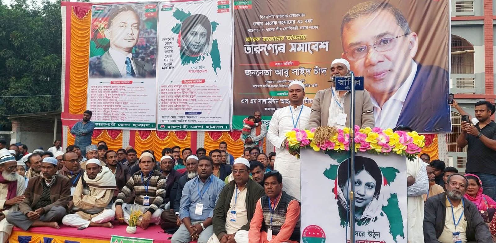 দোয়া মাহফিল ও তারুণ্যের সমাবেশে রাজশাহী জেলা ছাত্রদলের আহবায়ক এস এম সালাউদ্দিন আহমেদ শামিম সরকারের সভাপতিত্বে প্রধান অতিথি হিসেবে উপস্থিত ছিলেন কেন্দ্রীয় কমিটির সিনিয়র সদস্য, রাজশাহী জেলা বিএনপির আহবায়ক ও রাজশাহী-৬ (চারঘাট-বাঘা) আসনের দলীয় প্রার্থী আবু সাঈদ চাঁদ।
