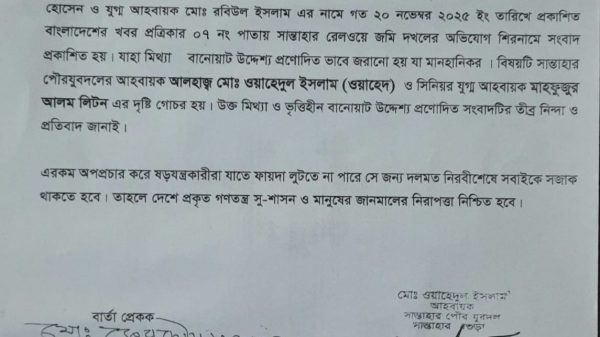 আদমদীঘি (বগুড়া) প্রতিনিধি: বাংলাদেশ জাতীয়তাবাদী যুবদল সান্তাহার পৌর শাখার সাত নম্বর ওয়ার্ড যুবদলের আহবায়ক মানিক হোসেন ও যুগ্ম আহবায়ক রবিউল ইসলাম এর নামে গত ২০ নভেম্বর ২০২৫ ইং তারিখে ঢাকা read more