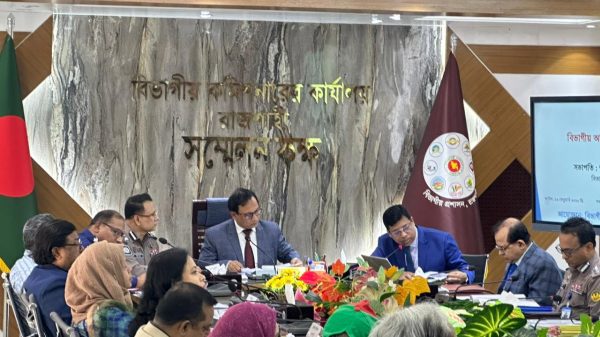 তন্ময় দেবনাথ রাজশাহী ব্যুরোঃ রাজশাহী বিভাগীয় আইন-শৃঙ্খলা কমিটির সভা অনুষ্ঠিত হয়েছে। সোমবার (২৩ ফেব্রুয়ারি) রাজশাহী বিভাগীয় কমিশনারের কার্যালয়ের হলরুমে এ সভা অনুষ্ঠিত হয়। সভায় সভাপতিত্ব করেন বিভাগীয় কমিশনার ড. আ. read more