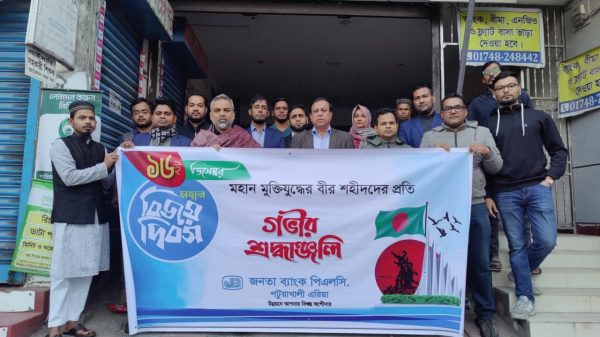জনতা ব্যাংক পিএলসি পটুয়াখালী এরিয়ার বিজয় দিবস র্যালী ওবায়দুর রহমান, (পটুয়াখালী) প্রতিনিধি ঃ জনতা ব্যাংক পিএলসি পটুয়াখালী এরিয়া অফিস কর্তৃক যথাযথ মর্যাদায় মহান বিজয় দিবস উপলক্ষে র্যালী আয়োজন করা হয়। read more