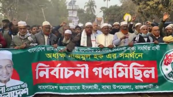 সাজ্জাদ মাহমুদ সুইট, রাজশাহীঃ রাজশাহী-৬ আসনে বাংলাদেশ জামায়াতে ইসলামী মনোনীত ও ১১ দলীয় নির্বাচনী ঐক্য সমর্থিত প্রার্থী অধ্যক্ষ নাজমুল হকের সমর্থনে এক বিশাল নির্বাচনী গণমিছিল অনুষ্ঠিত হয়েছে। রোববার ( ৮ read more