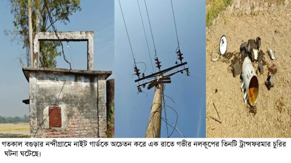 নন্দীগ্রাম (বগুড়া) প্রতিনিধিঃ বগুড়ার নন্দীগ্রামে নাইট গার্ডকে অচেতন করে এক রাতে গভীর নলকূপের তিনটি ট্রান্সফরমার চুরির ঘটনা ঘটেছে। গত সোমবার রাতে উপজেলার ১নং বুড়ইল ইউনিয়নের ৭নং ওয়ার্ডের কদমকুড়ি বড়ইচরা সারপুকুর read more