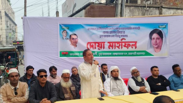 তন্ময় দেবনাথ রাজশাহীঃ রাজশাহী মহানগরীতে, সাবেক প্রধানমন্ত্রী ও বিএনপি চেয়ারপারসন বেগম খালেদা জিয়া’র দ্রুত আরোগ্য ও দীর্ঘায়ু কামনায় এক দোয়া-মাহফিল অনুষ্ঠিত হয়েছে। অনুষ্ঠানটি আয়োজন করেন সেচ্ছাসেবক নেতা সাঈদ আলী। শনিবার read more